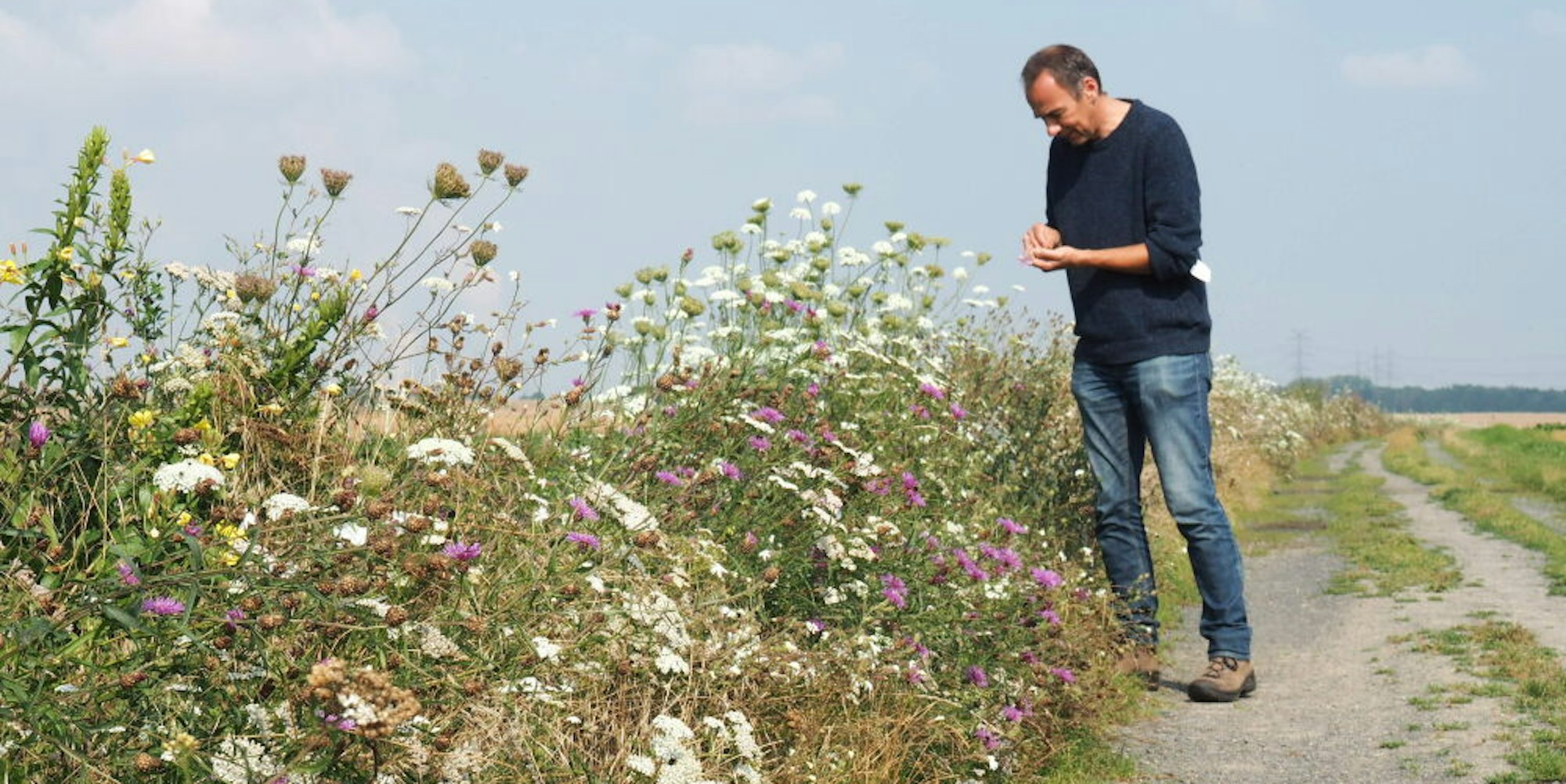 Der bunte Wegrain gefällt Christian Chmela und vielen Spaziergängern. Die Wildblumen am Wegesrand bieten Insekten und Vögeln von Ende April bis Ende August/Anfang September Nahrung.