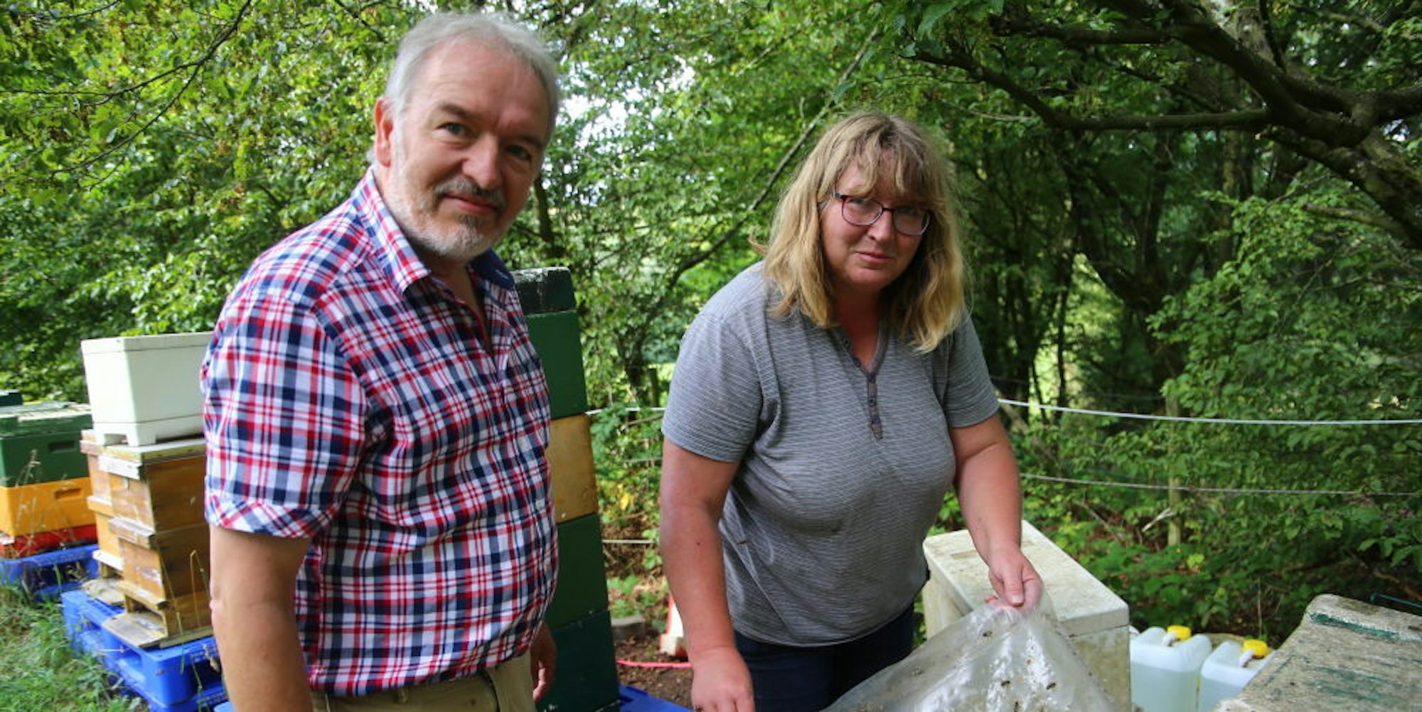 In einen der Bienenstöcke schauen Friedrich Bleckmann und Gabi Pütz.