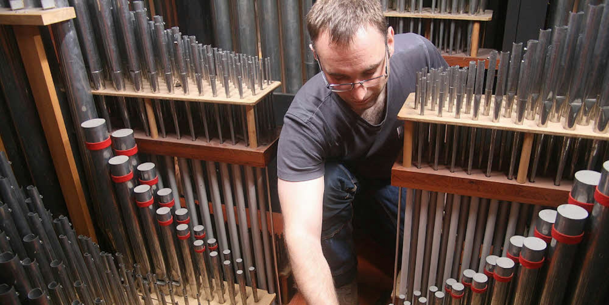 Markus Moutschen windet sich durch den engen Durchlass zum Orgelboden hinter dem Instrument. Zum turnusmäßigen Check gehört der Blick in den „Motorraum“. Vor den Wänden stehen in dichten Reihen große Holzpfeifen, auf dem Boden ein Gewimmel kleinerer Pfeifen, dazwischen schmale Holzstege. Was so unübersichtlich wirkt, ist tatsächlich in jeder einzelnen Position der 2792 Pfeifen genau so gewollt und entstammt dem Bauplan von Friedbert Weimbs, der mit der Orgel in St. Nikolaus einen Teil seines Meisterstücks ablieferte.