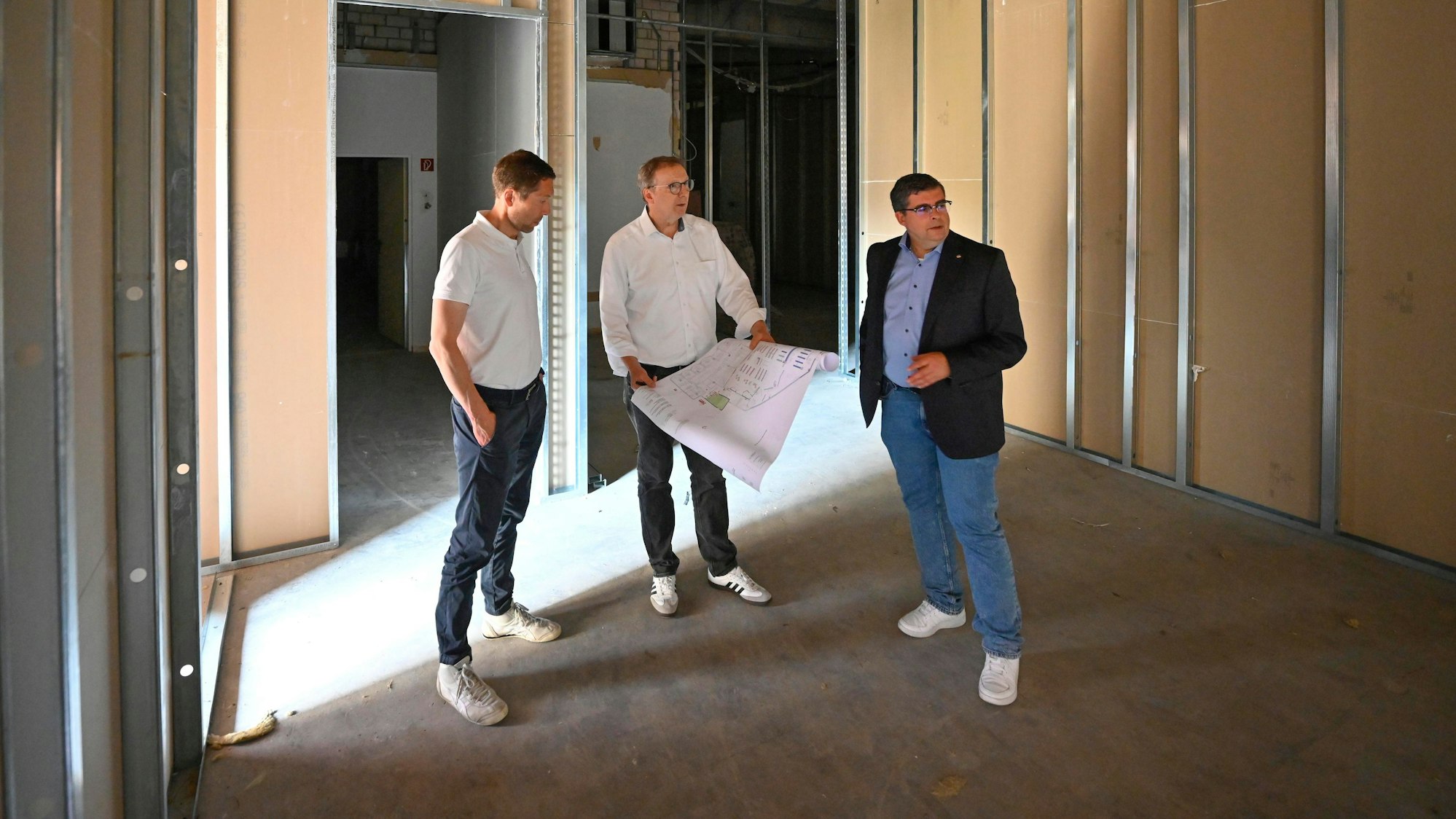Frank Helmenstein, Jürgen Hefner und Raoul Halding-Hoppenheit (v.r.) beim Baustellenrundgang
