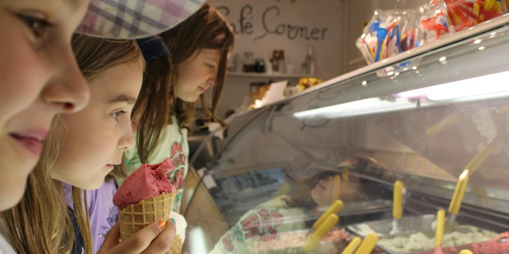 Die bunten Farben der Eistheke haben eine magische Anziehungskraft, wie hier im Eis-Laden Gea in der Kölner Südstadt.