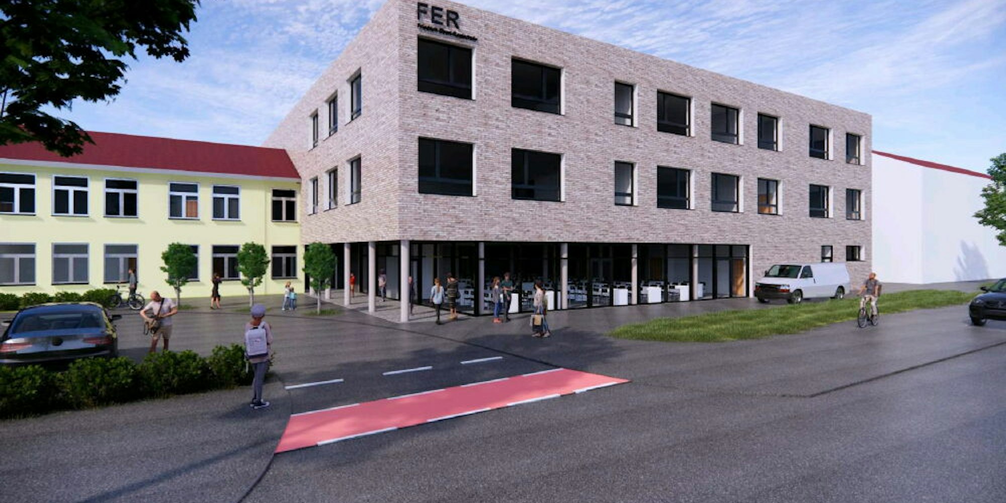 Im Neubau an der Krankenhausstraße werden Mensa, Aula und Klassenräume untergebracht.