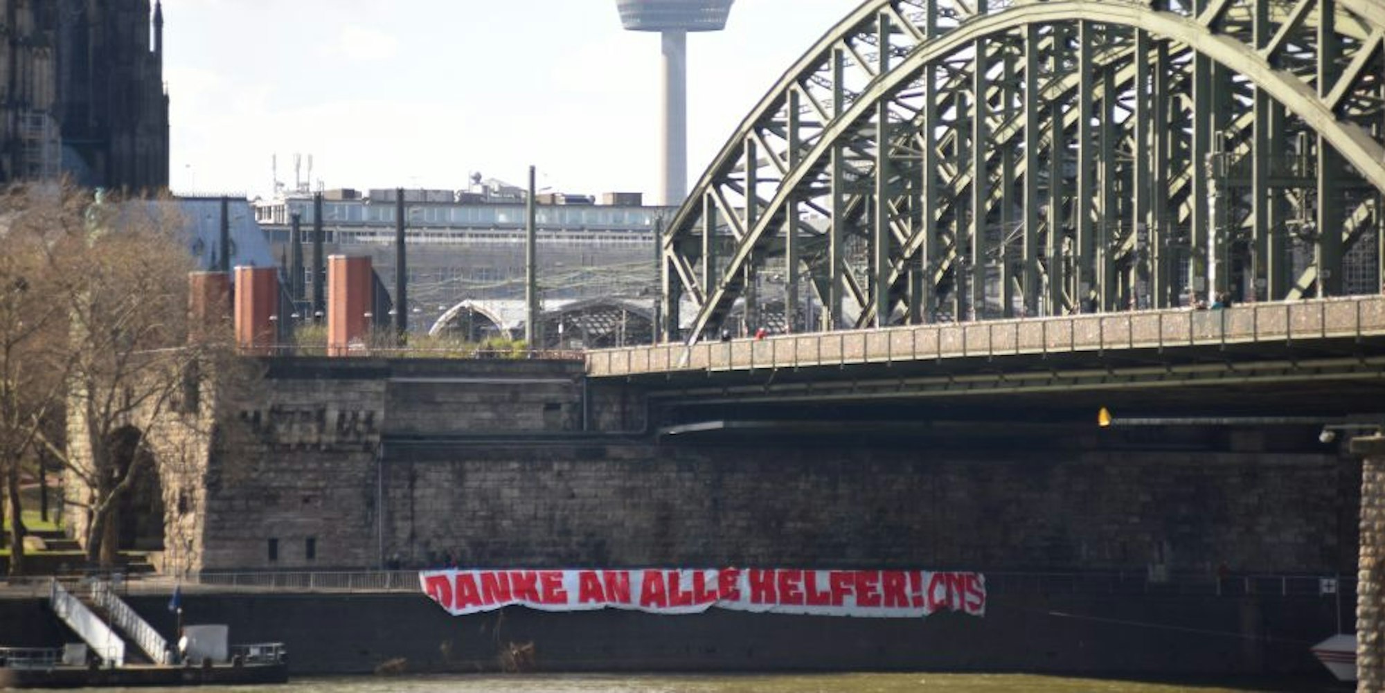 Köln – Um allen beruflichen und ehrenamtlichen Helfern in der Coronakrise zu danken, haben Unbekannte am Samstagmorgen ein großes Banner an einem Geländer der Hohenzollernbrücke angebracht. „Danke an alle Helfer“ steht da in roter Schrift.