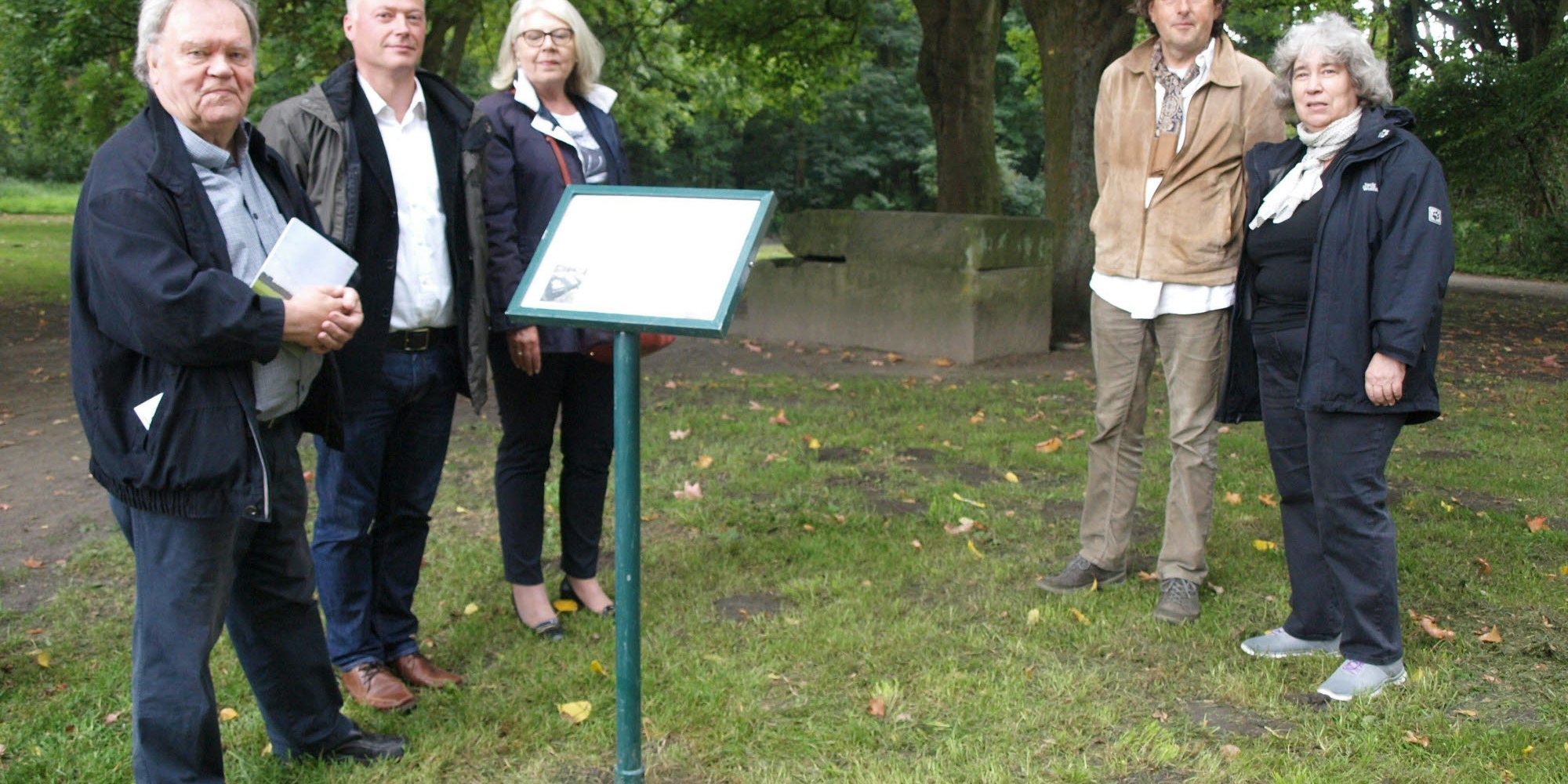 Heinz Günter Horn, Alfred Schäfer, Helga Blömer-Frerker, Roland Schüler und Renate Franz (v.l.) an dem neuen Informationsschild.