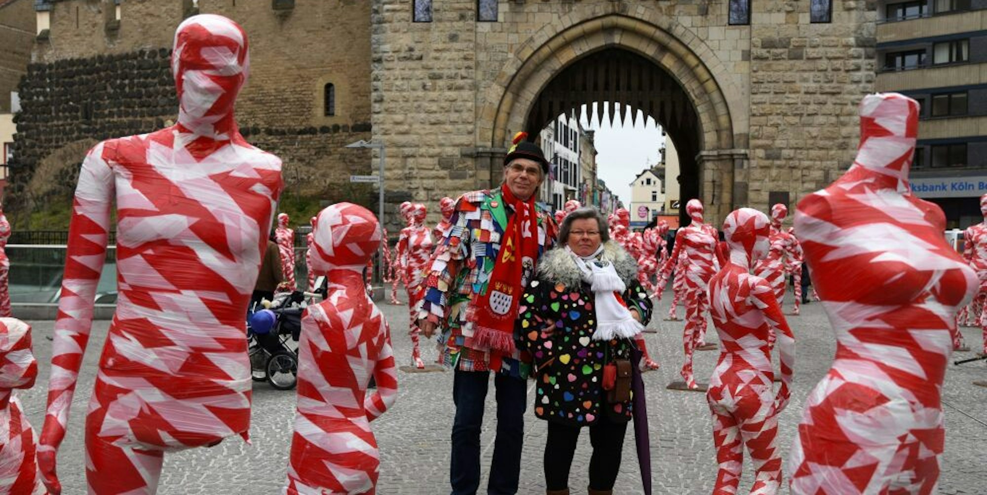Gegen 9.30 Uhr herrscht auf dem Chlodwigplatz ein hektisches Gewusel in Rot und Weiß. Nein, da formieren sich nicht einige Dutzend Lappenclowns zum „Zoch vor dem Zoch“, auch wenn das aus der Ferne zunächst so wirkt. Bei näherem Hinsehen erkennt man 111 Schaufensterpuppen, die jeweils fest mit rot-weißem Flatterband umwickelt ist. Der Bonner Künstler Dennis Josef Meseg hat dort seine Installation „It is like it is“ als Mahnmal zur Corona-Krise aufgestellt. Zuvor hatte er seine Puppen – aus der Insolvenz einer Baumarkt-Kette übernommen – schon vor dem Reichstag in Berlin, an den Landungsbrücken in Hamburg und auf dem Marienplatz in München gezeigt. Und auch für den Kölner Rosenmontag hat Meseg eine offizielle Genehmigung. „Der Künstler hat nichts falsch gemacht“, bestätigen anwesende Polizisten. Ein willkommenes Fotomotiv. „Nä, nä, wat is bloß aus den Roten Funken geworden“, wundern sich zwei ahl Möhne und lachen.