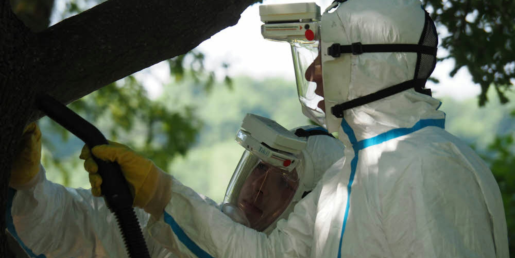 Köln – Irgendwie bedrohlich wirkte die Szenerie im Friedenswald beim Forstbotanischen Garten, als sich die Mitarbeiter einer Baumpflegefirma mit Atemmaske und im Ganzkörperschutzanzug ans Werk machten – sie saugten Nester des Eichenprozessionsspinners ein, mit einem Spezialstaubsauger, der auch für die Aufnahme von Asbeststaub geeignet ist.