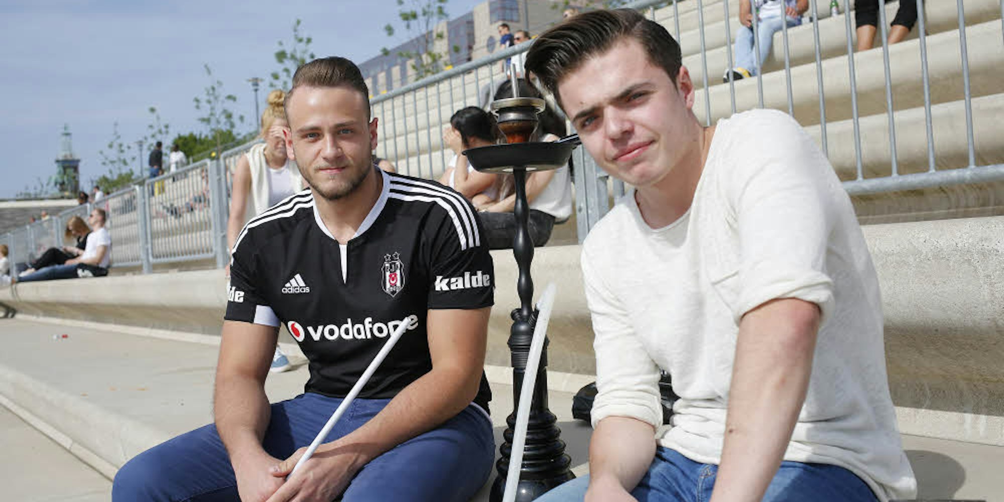 Burak Carikci (l.) und Kevin Heinz rauchen auf dem Rheinboulevard Shisha.