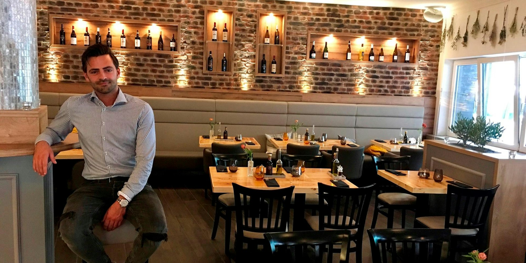 Maximilian Wagner in seinem Restaurant an der Lindenstraße. Die Tischplatten sind aus italienischen Weinkisten gebaut.