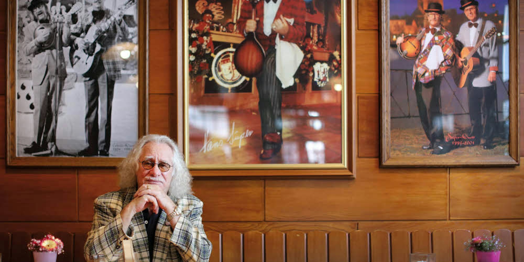Hans Süper im „Sölzer Klaaf“ vor Bilder seiner großen Karriere, links das Colonia Duett, rechts das Süper Duett. Ein Foto aus dem Jahr 2016.