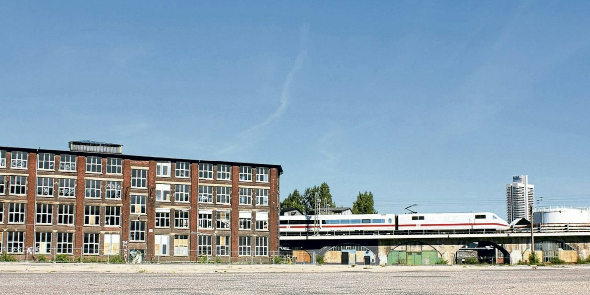 Asphaltflächen und alte Industriearchitektur wie der eckige Rundbau prägen das Bild auf dem Gelände an der Deutz-Mülheimer Straße.