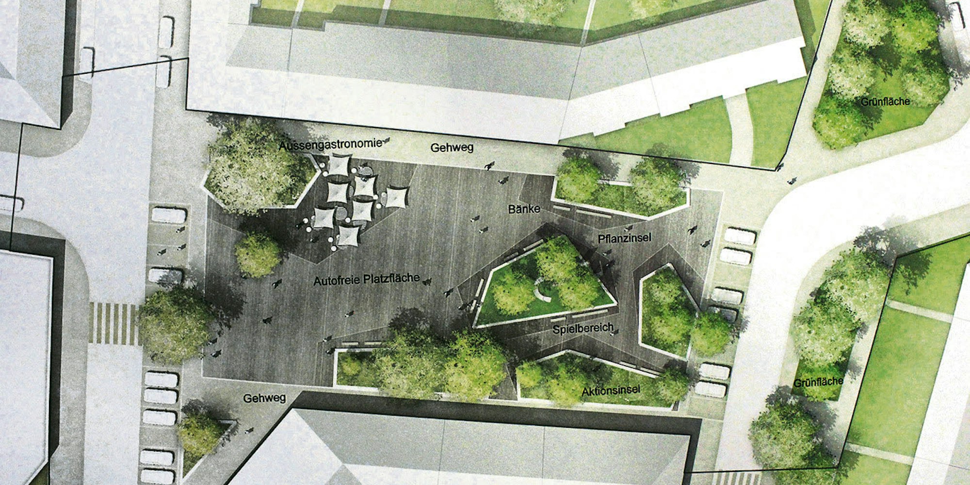 „Wir streben eine generationenübergreifende Nutzung der neuen Platzfläche an“, betonte Rheims. Auf Freiflächen, die für die Anwohner geschaffen werden sollen, seien Bereiche zum Verweilen, zum Spielen sowie Außengastronomie geplant. Die erste Variante sah vor, die Herler Straße nach Süden zu verlegen, wo sich aktuell ein Parkplatz befindet. So entstünde ein großer Freiraum mit viel Sonne, der als Erholungs- und Aufenthaltsfläche genutzt werden könnte. Bei der zweiten Variante würde die Herler Straße im Norden bleiben. Doch die Stellfläche für Autos würde wegfallen. Rheims: „Wir bekämen dann Aufenthaltsflächen auf beiden Seiten des Platzes.“ Beim letzten Vorschlag würde der Platz vollkommen autofrei. Er stünde nur noch Fußgängern und Radfahrern offen. Der Verkehr würde über Nebenstraßen umgeleitet.