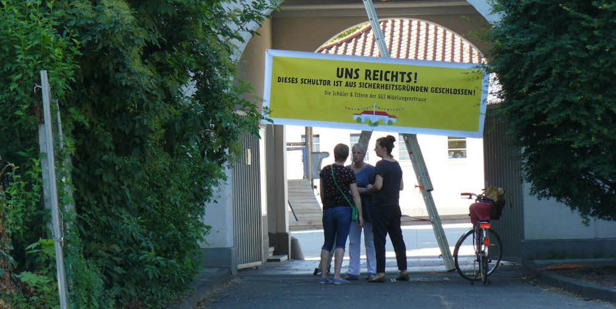 Quer über den Torbogen an der Nibelungenstraße wurde ein Banner angebracht: „Uns reicht’s – Dieses Schultor ist aus Sicherheitsgründen geschlossen.“ Zu dem Schritt hätten sich Lehrer und Eltern gemeinsam durchgerungen, sagte Lang. Grund sei der Baustellenverkehr vor der Schuleinfahrt. An der Nibelungenstraße errichtet die Wohnungsgesellschaft GAG Mehrfamilienhäuser, in mehreren Bauabschnitten. Gegenwärtig wird ein Block direkt neben der Schule hochgezogen.
