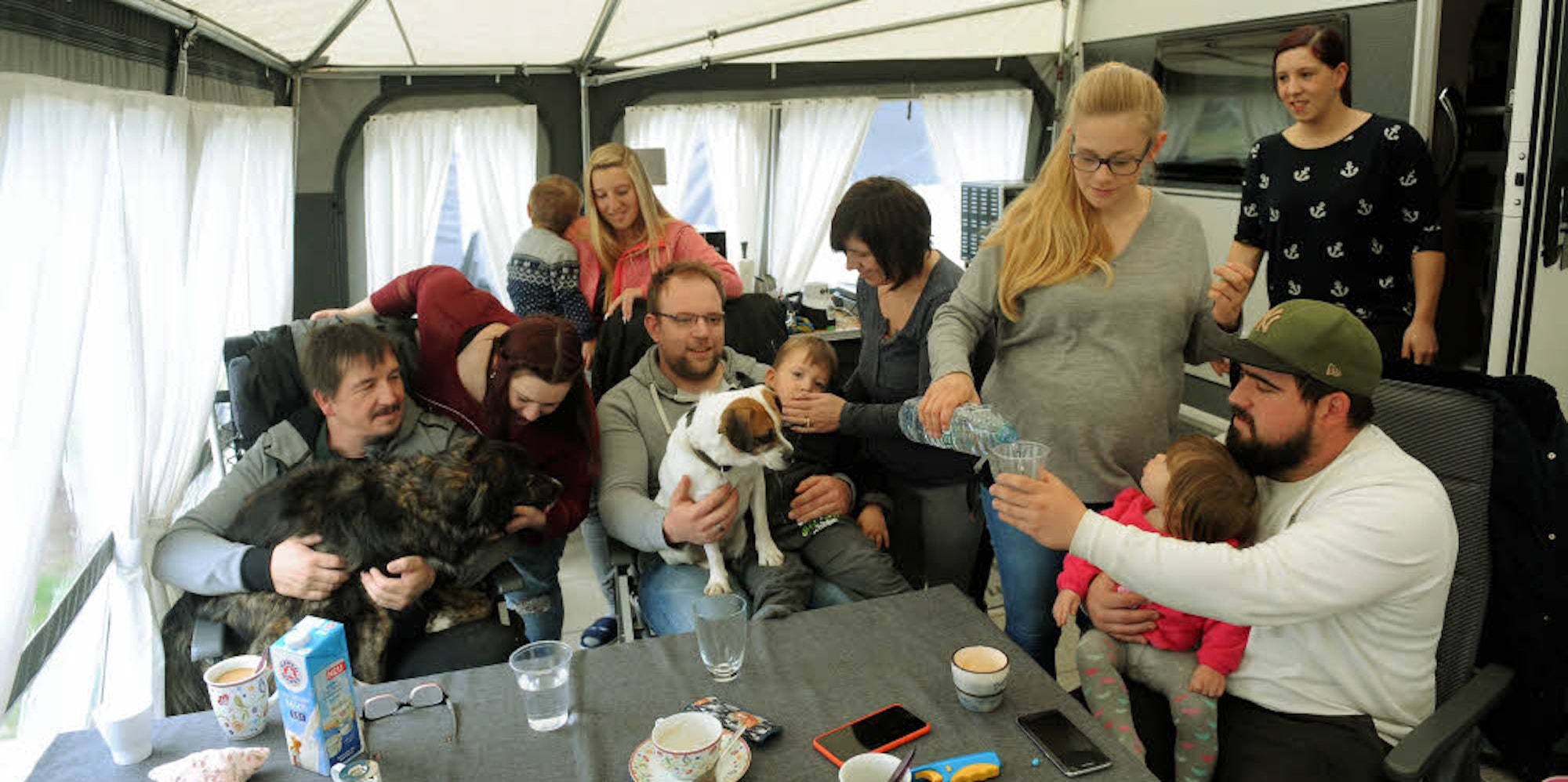 Die Familie Kösters im Vorzelt ihres Wohnwagens
