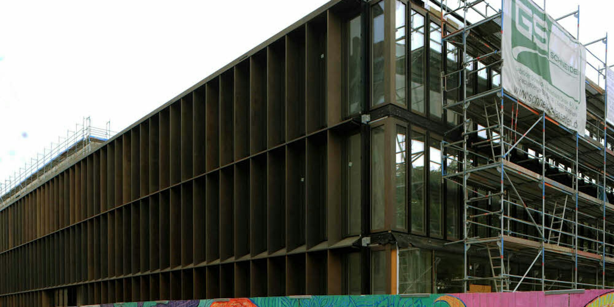 Die aus Baubronze bestehende Lamellen-Fassade des Archiv-Neubaus am Eifelwall ist weitgehend montiert.