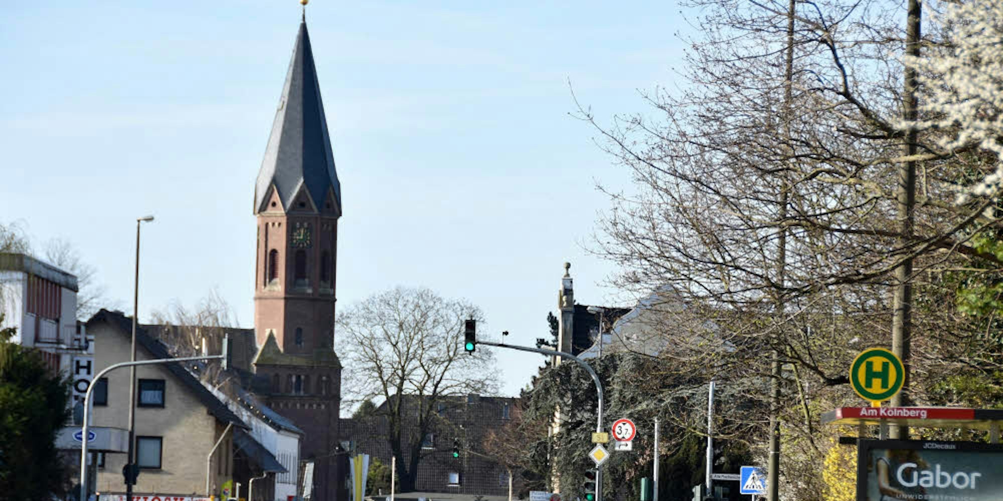 Blick von der Brühler Landstraße auf St. Blasius. Links davon geht es zum „Wahrzeichen“ von Meschenich, dem Kölnberg.