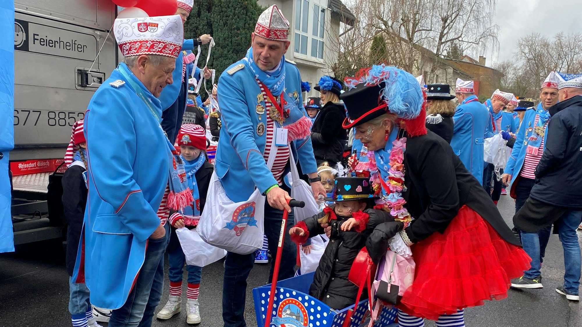 Am Rand wartet schon das Dreigestirn der Altgemeinde Rodenkirchen, das vormittags bereits im Sürther Zoch dabei war.