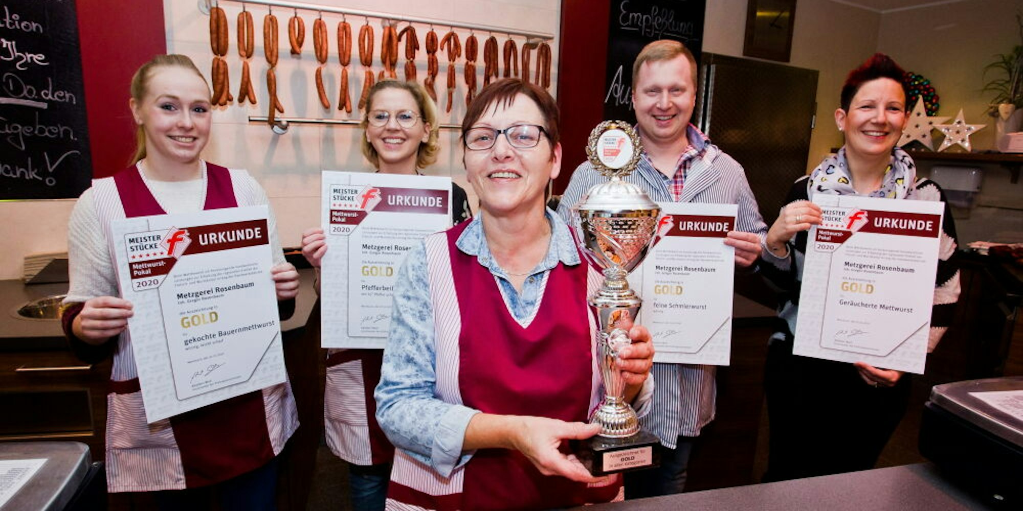 Morsbach – Einmal Mett ergibt am Ende viele verschiedene Wurst-Leckereien. Ob geräuchert oder im Glas eingekocht, als scharfe Pfefferbeißer zum schnellen Snacken, als Wurst für den Eintopf oder zu Aufschnitt verarbeitet – das Sortiment ist groß. Vier der Mettwurstsorten aus dem Hause Rosenbaum sind im vergangenen Jahr vom Fleischereilandesverband mit dem Prädikat Gold ausgezeichnet worden, dem Siegel für ein fehlerfreies Produkt. Damit ist die Morsbacher Metzgerei eine von insgesamt 40 lokalen Produktionsstätten in ganz Nordrhein-Westfalen, die den „Meisterstücke Mettwurst-Pokal 2020“ erhalten haben.