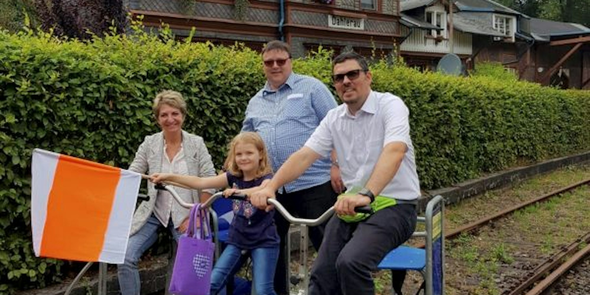 Testfahrt mit Bürgermeister: Gemeinsam mit Jörg Bukowski (r.) und seiner Tochter stiegen Nadja Maria Schwendemann und Markus Heibach in Radevormwald-Dahlerau auf die Draisine. Solche Fahrzeuge könnten demnächst zwischen Morsbach und Hermesdorf rollen.