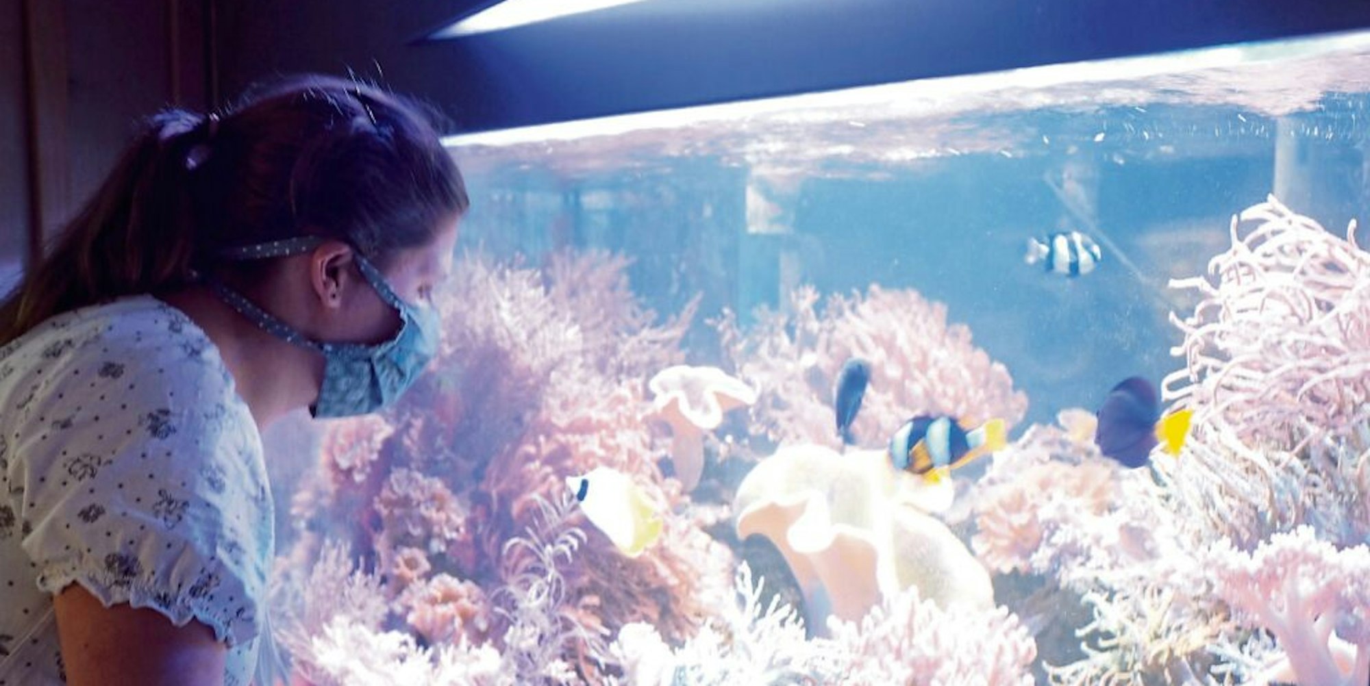 Ein 6000 Liter fassendes Meerwasser-Aquarium, das mit Fischen und Korallen bestückt ist, steht im frei zugänglichen Erdgeschoss des Naturzentrums.