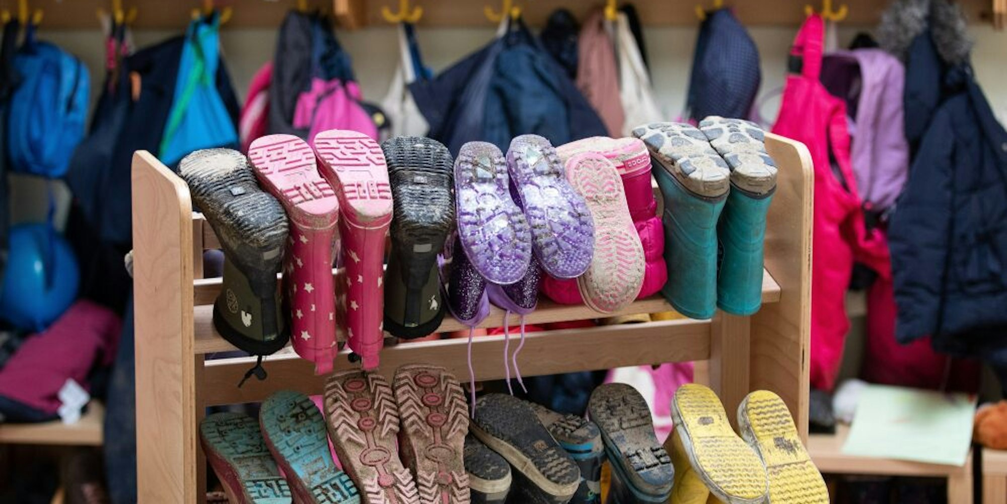 Kinderbekleidung und Stiefel in einer Kita in NRW