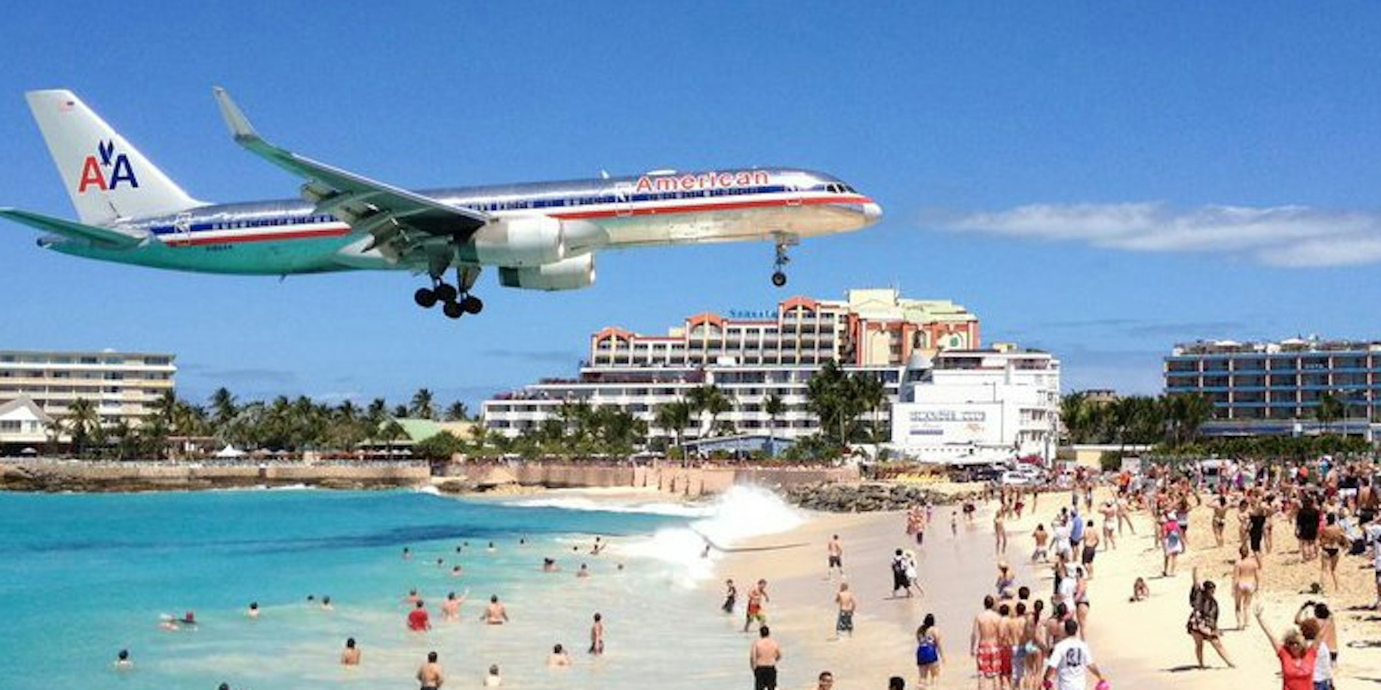 Auf der Karibikinsel St. Maarten düsen landende Maschinen direkt über die Köpfe der Strandgänger hinweg.