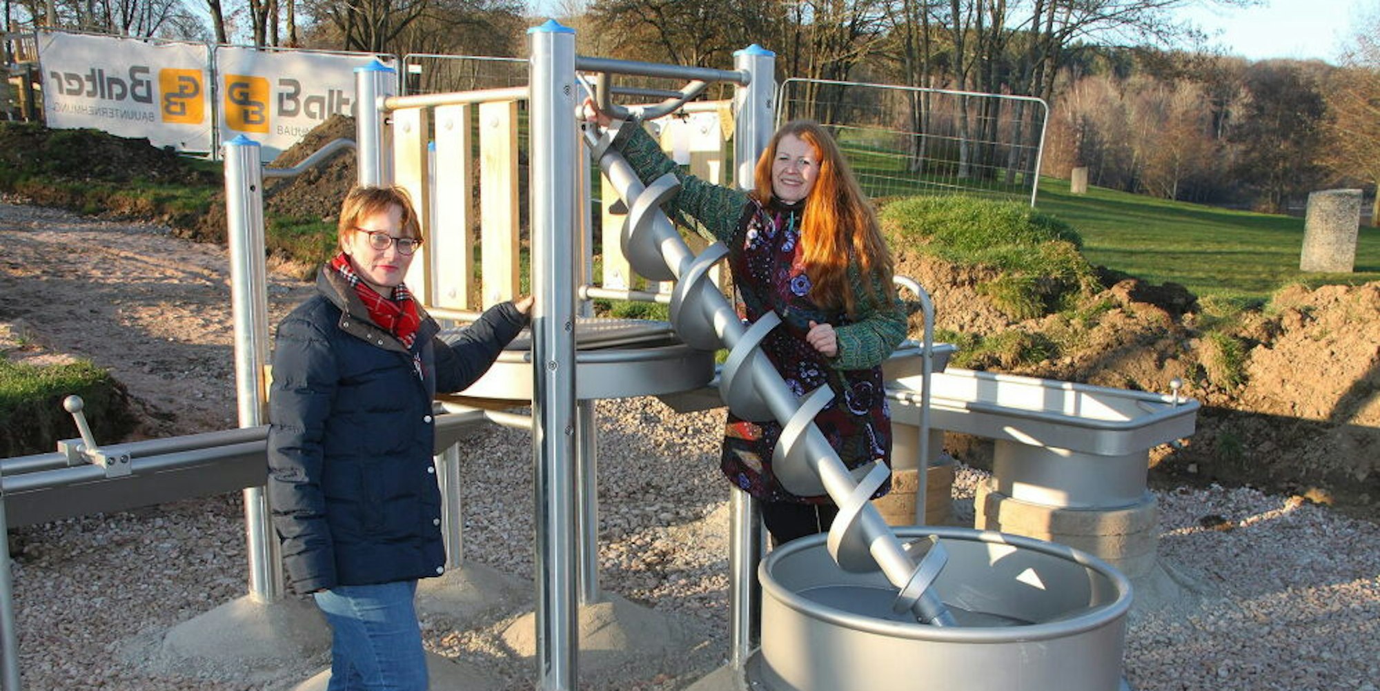 Simone Böhm, Vorsitzende des Vereinskartells Freilingen, und Judith Maur, ihre Nachfolgerin als Ortsvorsteherin, stehen vor einem „Riesenquirl“. Doch was wie ein Haushaltsgerät im XXL-Format aussieht, ist Teil der „Wasserspielanlage Artikel Nr. 0-34354-051“ eines Fachanbieters. Der Edelstahl glänzt in der Sonne. Und drum herum ist auch keine Küche, sondern der gerade entstehende neue Spielbereich für die Kinder am See.