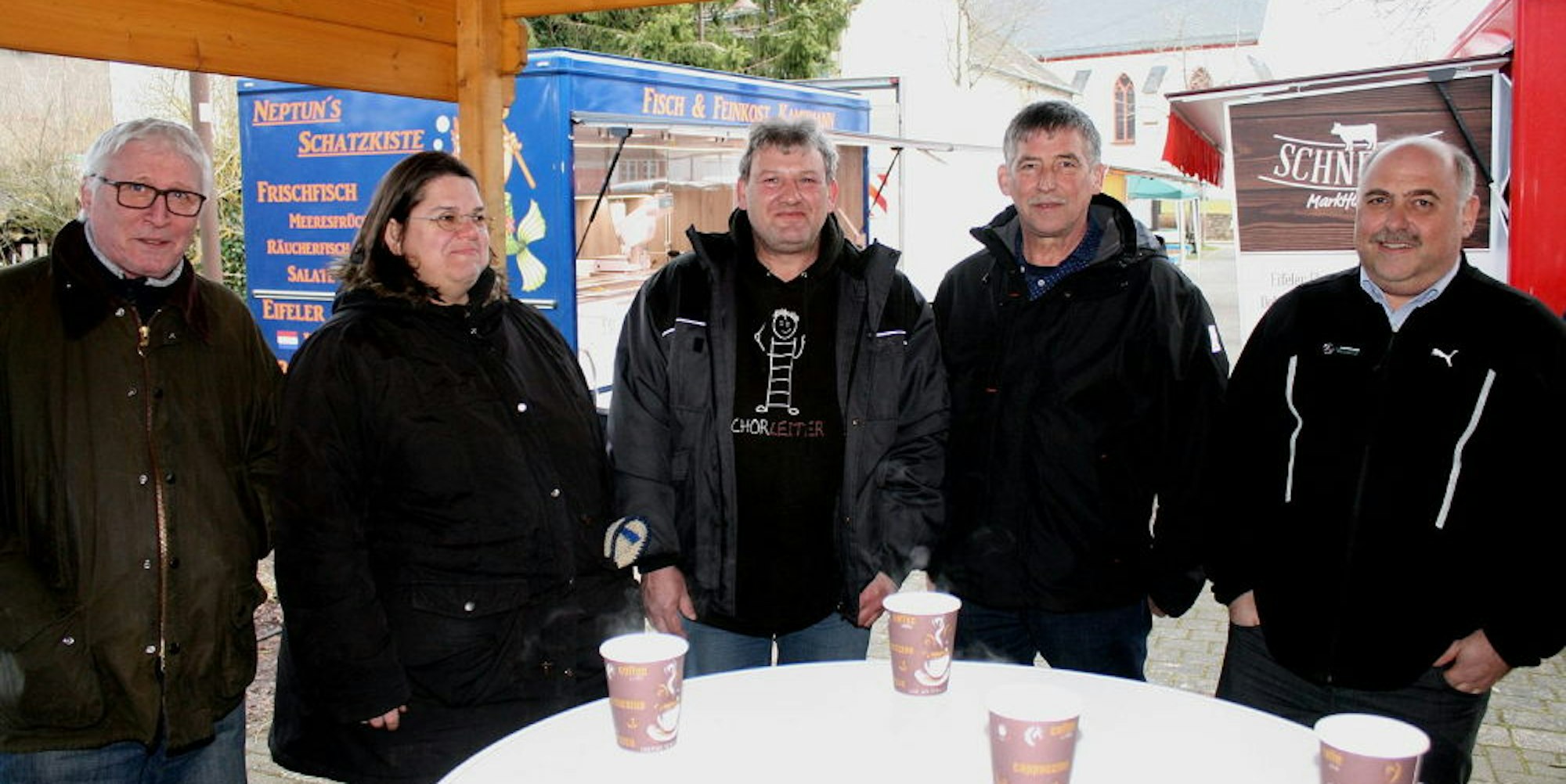 „Ohne Ortsvorsteher läuft es doch viel besser“, sagt Ryszard Sikorski (links) in der munteren Runde der Ripsdorfer auf dem Wochenmarkt. Mit dabei auch Albert Ehlen (Mitte) und Mathias Schoenen (rechts daneben).