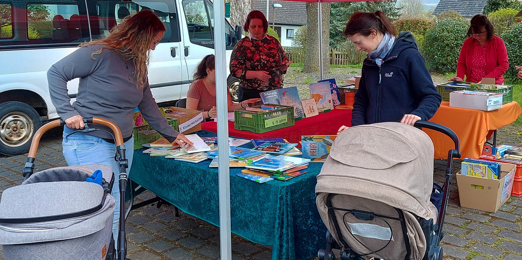 Maximal sechs Wochen können sich auch Anna Hantel und Stefanie Hellendahl, die gerade mit ihren Babys Noah und Jonah im Kinderwagen an den Büchereistand kommen, Bücher ausleihen. Sie können sich alternativ aber auch aus dem Bestand in Blankenheim ganze „Bücherpakete“ nach Uedelhoven bestellen, und sie können sich E-Books per App ausleihen. „Bei diesem Angebot arbeiten wir mit der Stadtbibliothek Euskirchen zusammen, das Angebot ist noch im Aufbau, aber schon jetzt sehr groß“, so Maria Kraft.