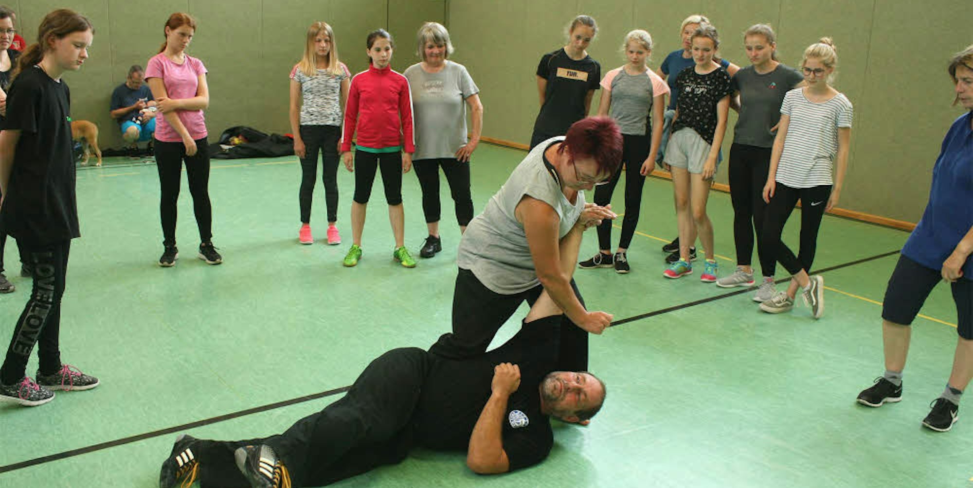 Thomas Becker geht auf den Boden der Turnhalle, aufs Kreuz gelegt von der zierlichen, 13-jährigen Schülern Marie-Sophie Schmitz aus Schmidtheim. Warum der Teenager sich für den Kurs angemeldet hat? „Ich habe schon manchmal Angst vor den pöbelnden Jungs auf dem Schulhof“, gesteht sie offen. Andere Teilnehmerinnen aus dem Gemeindegebiet Dahlem haben schon Schlimmeres erlebt: Sie berichten beispielsweise, dass sie in der Disco von Männern angegrapscht worden sind.