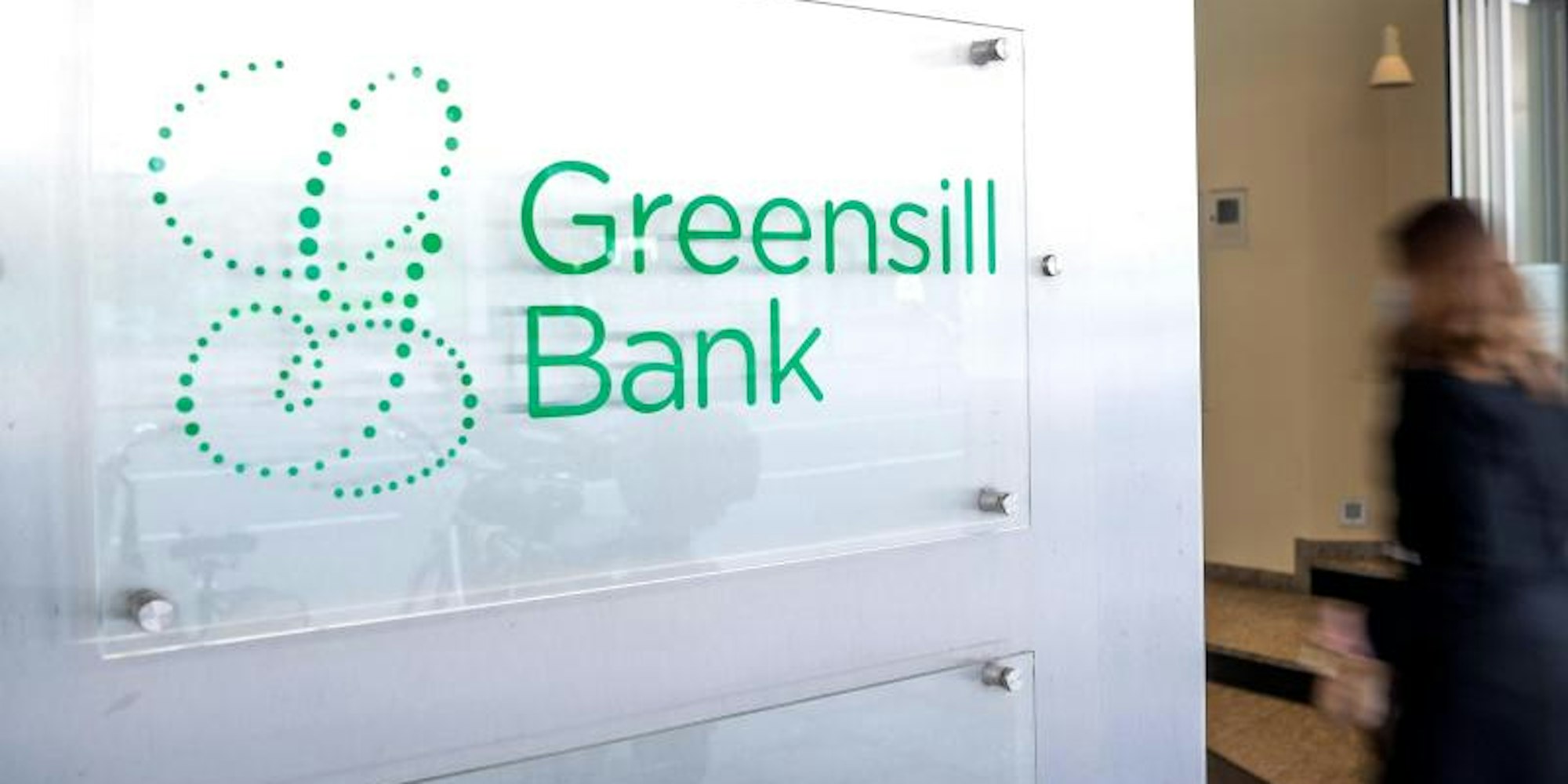 Ein Schild mit dem Firmennamen „Greensill Bank” hängt am Eingang der Bremer Privatbank.