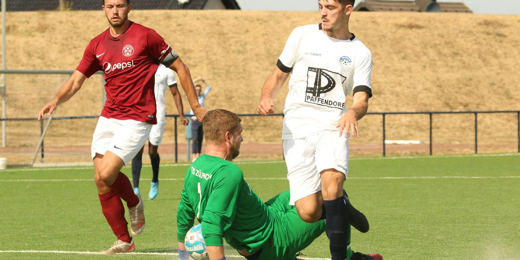 Berührung oder nicht? Zülpichs Torwart Robin Metternich bestreitet es, den Ball mit der Hand gespielt zu haben.
