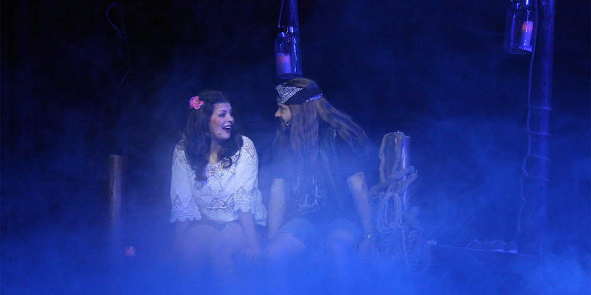 Trautes Glück am Bootssteg auf der Bühne: „Sieben Tage, sieben Nächte“ singt Juliane Bischoff als Jessica mit ihrem Bühnenpartner Mischa Mang als Wolf im Wahnsinn-Musical.