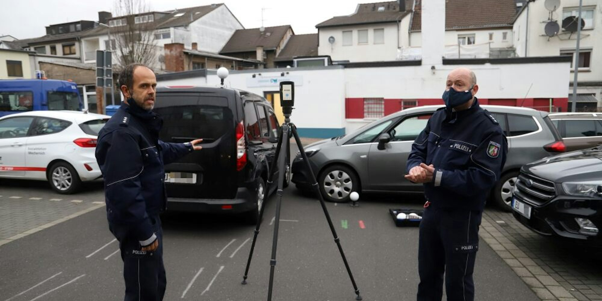„Technisch ist das ein Quantensprung“, so Polizeisprecher Franz Küpper über den 3D-Scanner, der seit Mitte des Jahres eingesetzt wird. Es ist eines von elf Geräten, die NRW-weit im Einsatz sind. Damit soll das bisherige Monobildverfahren ersetzt werden, mit dem Unfallstellen aufgenommen wurden. „Bislang musste die Unfallstelle geräumt sein, damit das Team arbeiten kann“, sagte Otmar Baur vom Verkehrskommissariat. Das sei in Zukunft nicht mehr notwendig, also könnten Sperrungen schneller aufgehoben werden.