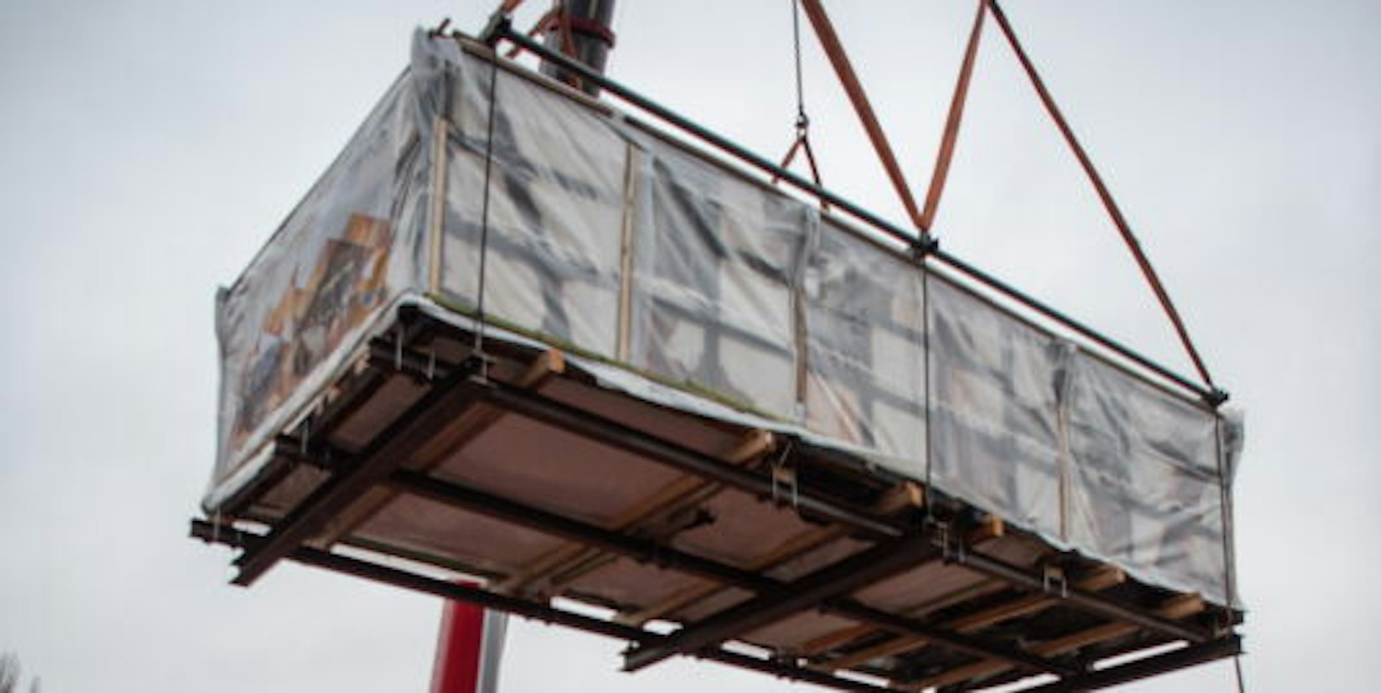 Schwebte hoch über Roggendorf: das Obergeschoss des rund 200 Jahre alten Fachwerks. Es wurde per Tieflader über Nacht ins Freilichtmuseum gebracht.