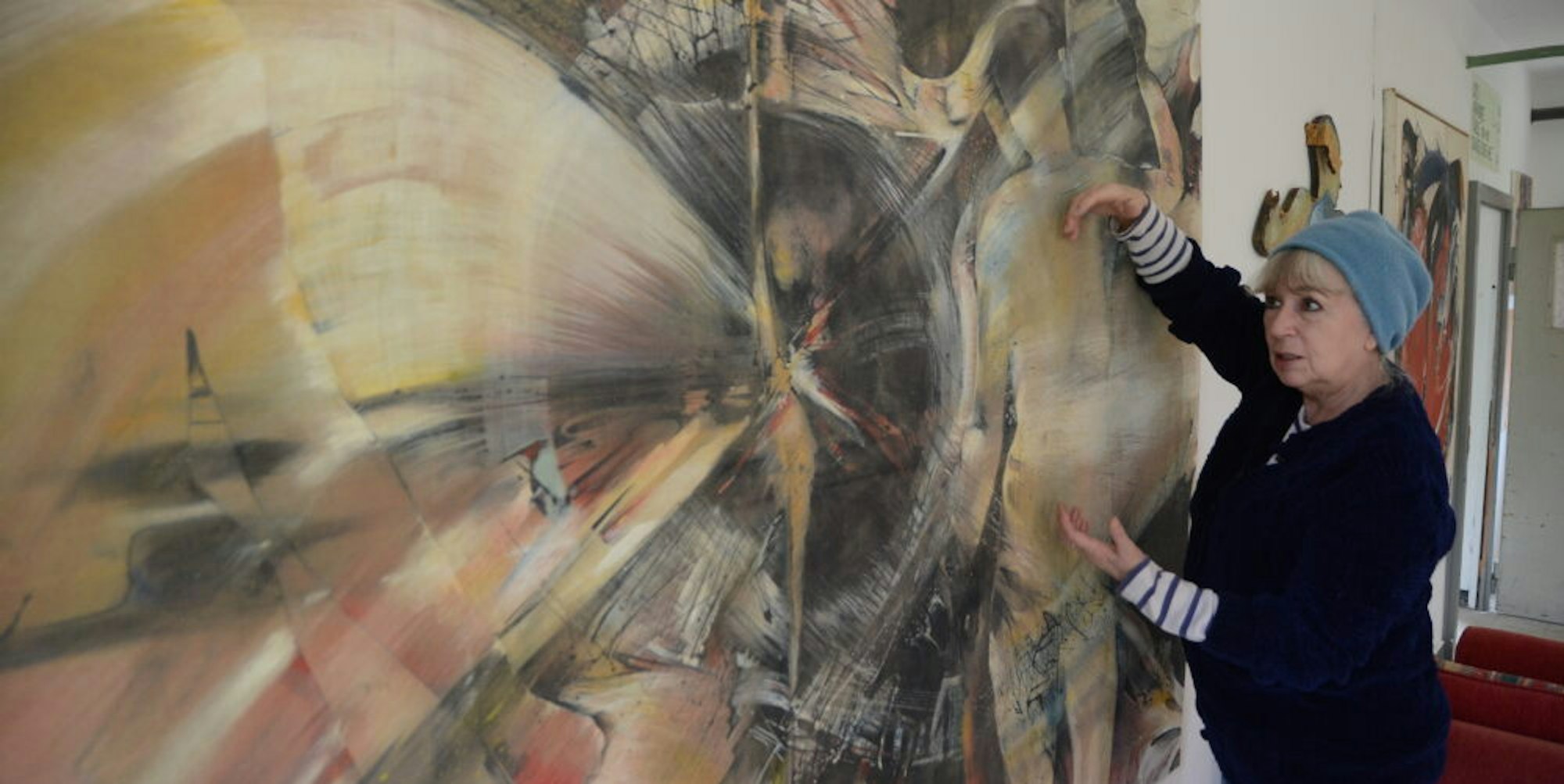 Ein bisschen Drama ist bei der Künstlerin natürlich auch dabei: „Das sind die Sterbesachen“, sagt sie über die im ersten Raum hängenden Werke, die Schlamm und Schimmel nach der Restauration zurückerobern. Zentral baumelt ein zerfetztes, verdrehtes Ölgemälde von der Decke – ein starkes Symbol für alle Werke, die unwiederbringlich verloren sind.