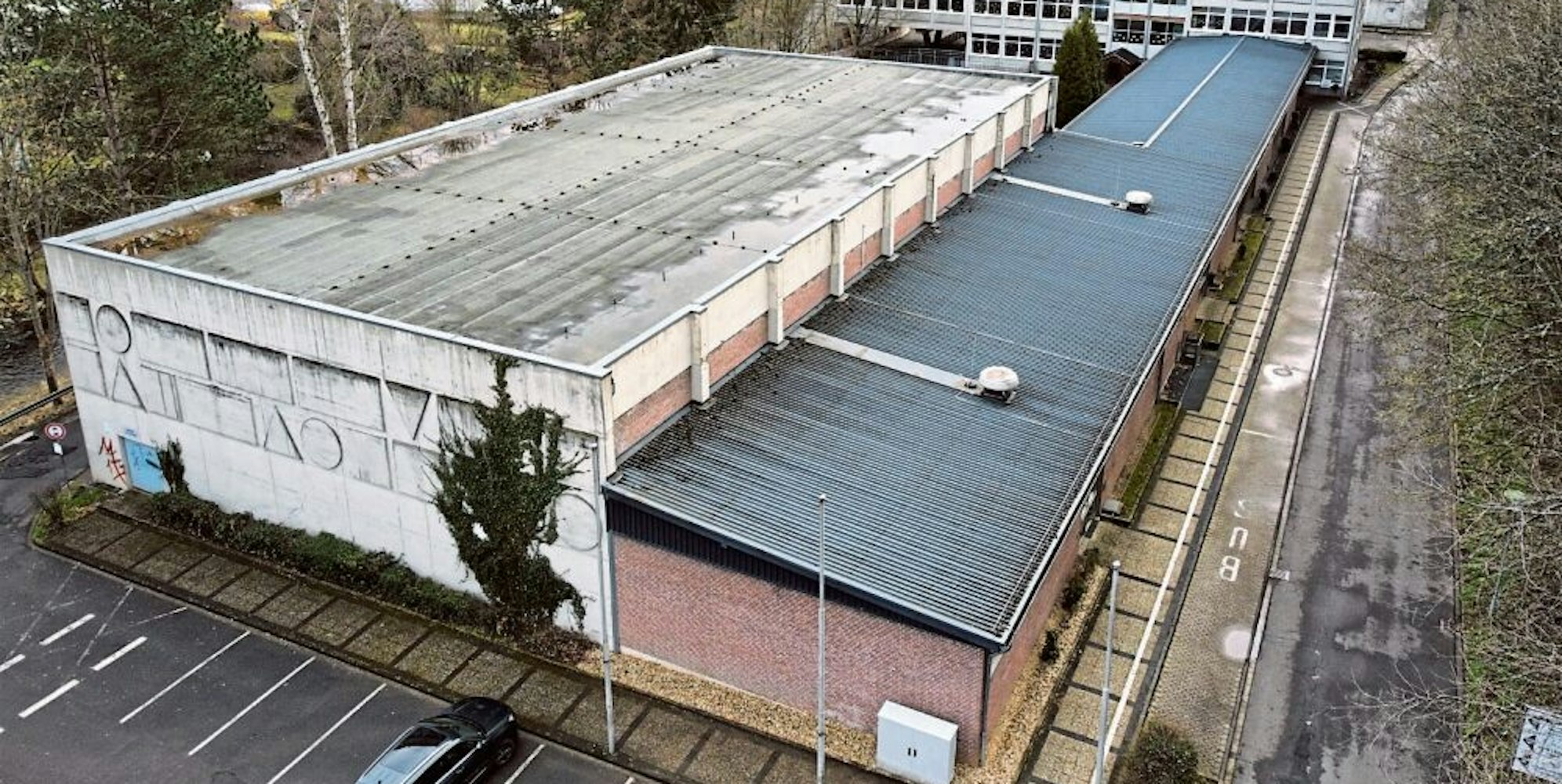 Das Flachdach der Halle wird saniert und erhält künftig eine geringe Neigung. Auch die Umkleiden (r.) werden erneuert.