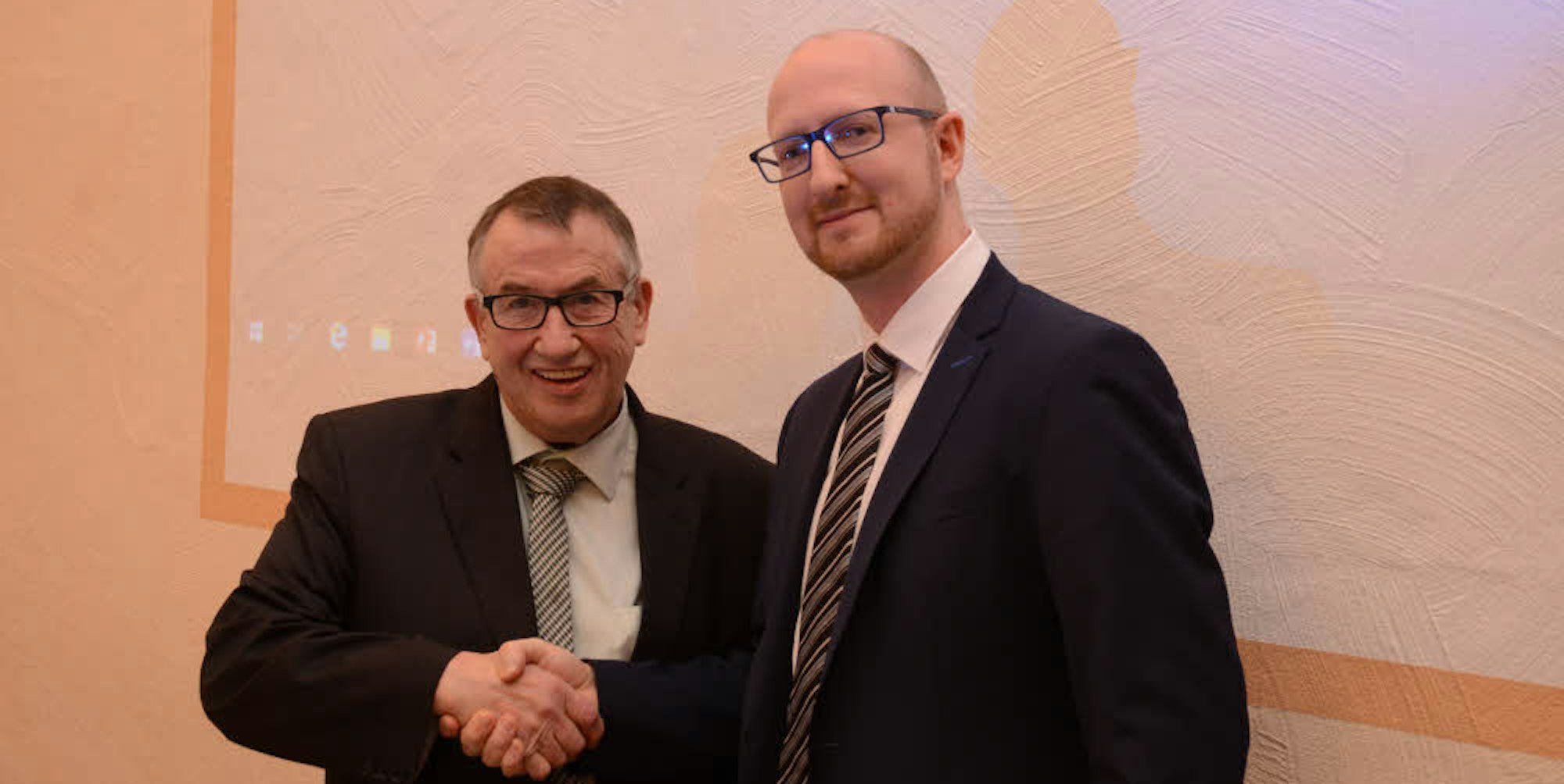 Mit der Vereidigung ist Ingo Pfennings (r.) nun auch offiziell Bürgermeister. Erster Gratulant ist Werner Kaspar.