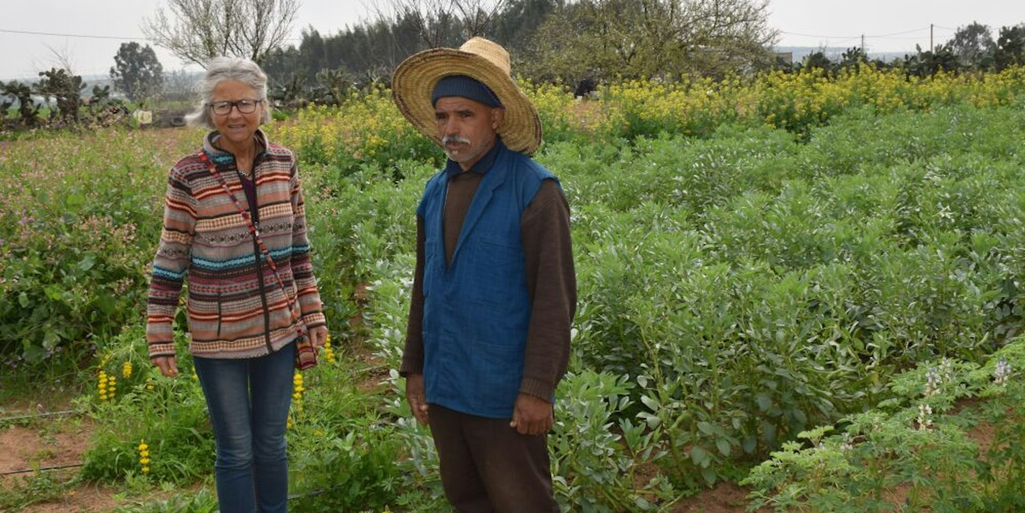 Ein Feld des FAP-Projekts in Marokko inspiziert Stefanie Christmann mit Landwirt Mohamed Kal.