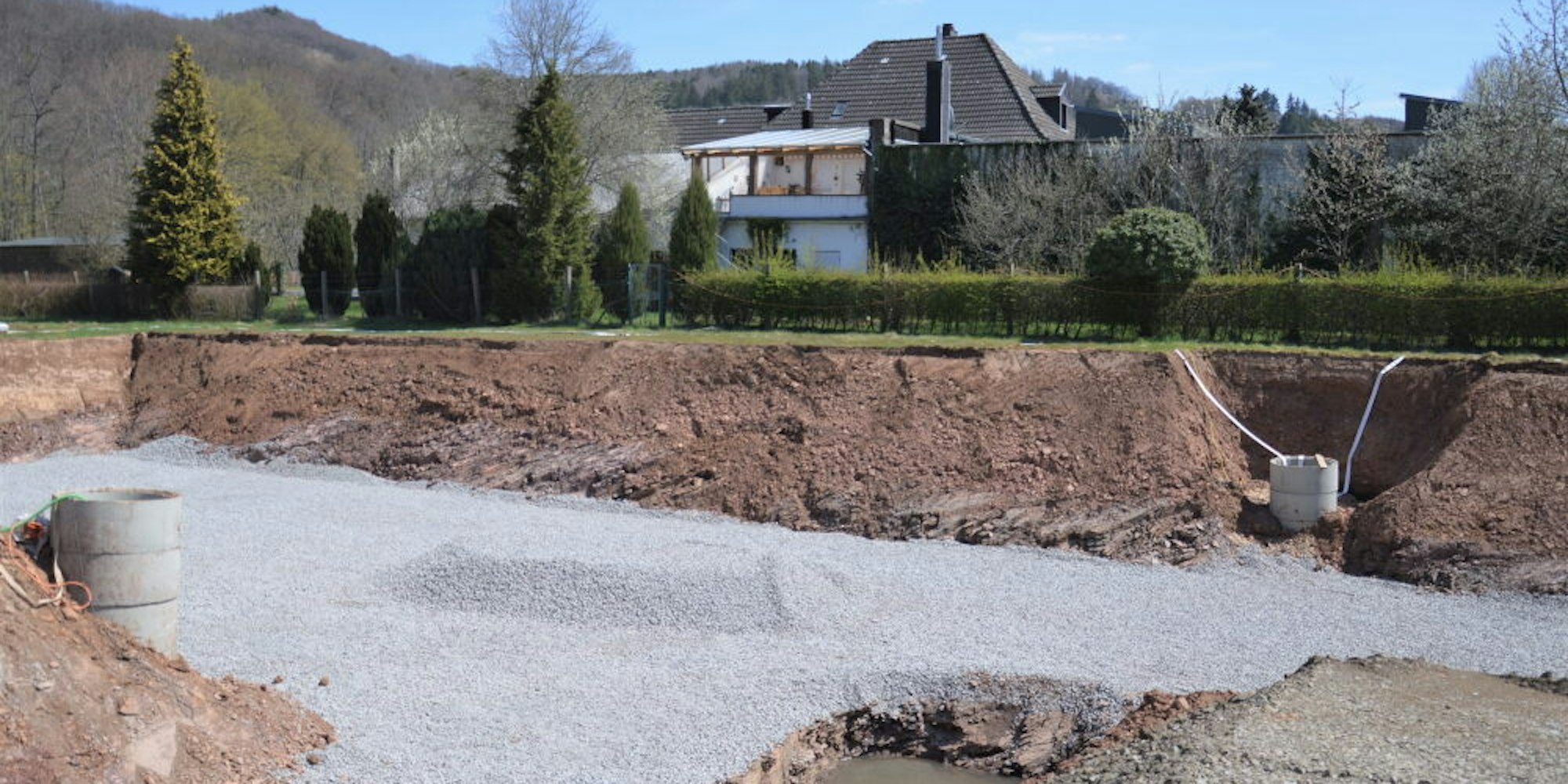 Für das dreistöckige Gebäude mit 24 Wohnungen wurde eine tiefe Baugrube ausgehoben und mit Schotter aufgefüllt.