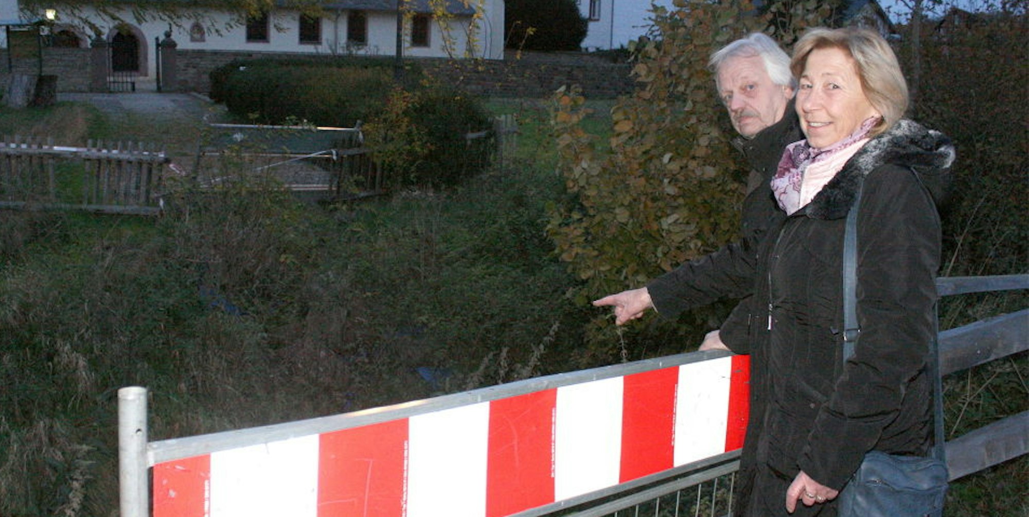 Da klafft die Lücke: Von der Merodestraße in Vlatten ist derzeit kein Übergang zur Pfarrkirche möglich. Ortsvorsteherin Ingrid Müller und Kurt Krüttgen vom Heimatverein Vlatten hoffen auf ein Provisorium, bis die neue Brücke endlich gebaut ist.