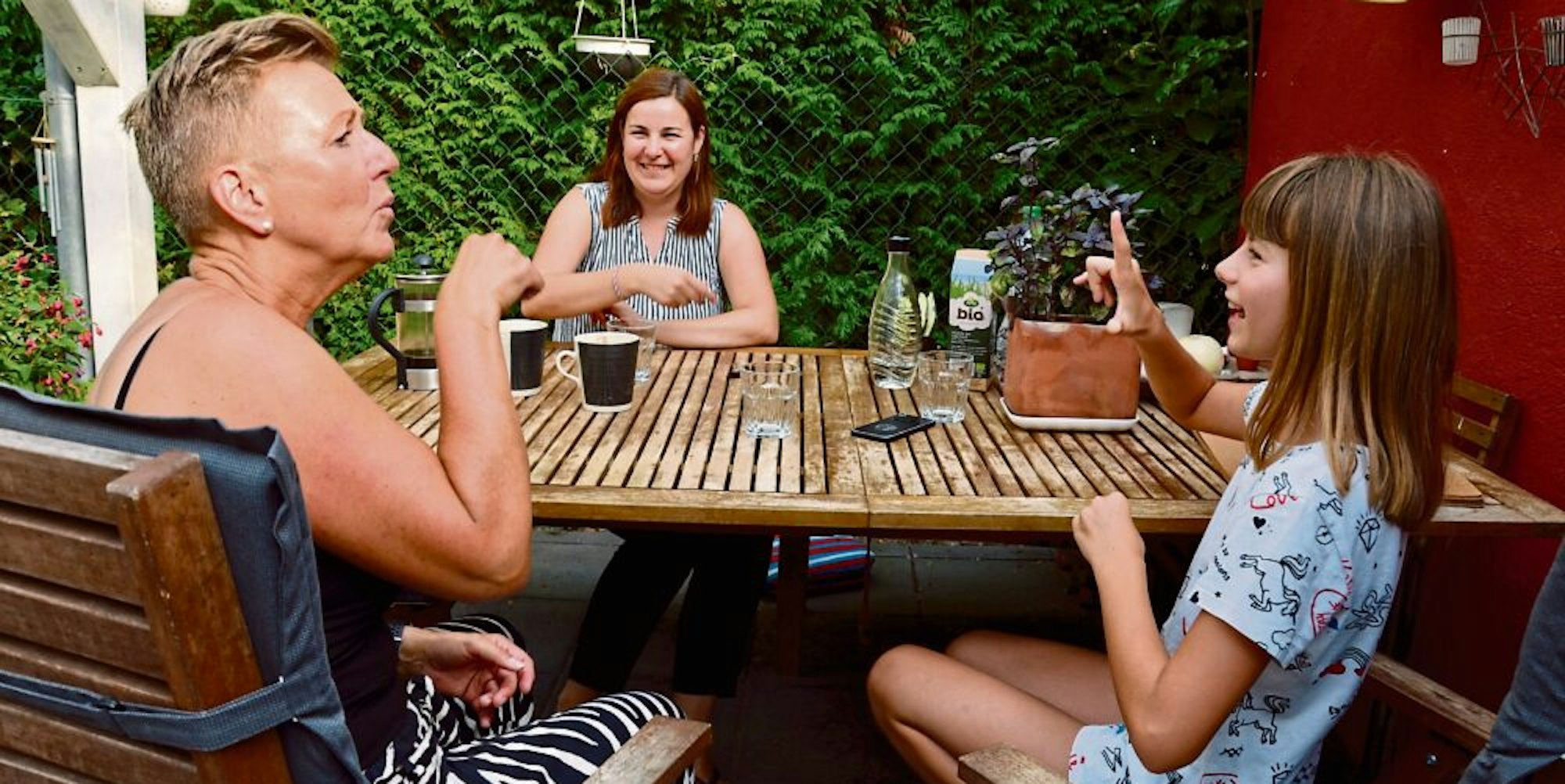 Fühlte sich zeitweise schlechter informiert als Menschen, die hören: Christina Sohn, hier mit Tochter Leana und Gebärdensprachdolmetscherin Claudia Dubbelfeld (l.).