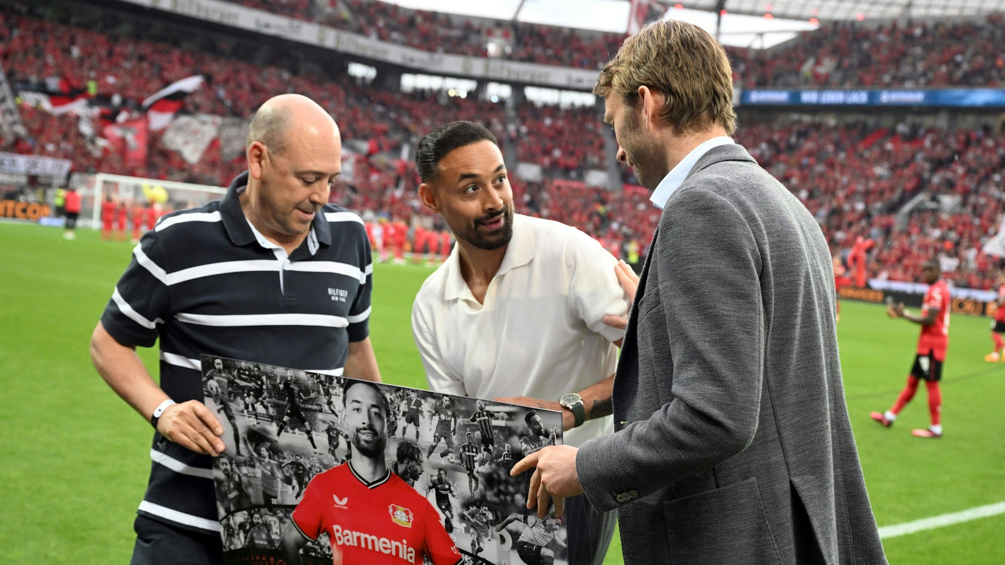 Fernando Carro und Sport-Geschäftsführer Simon Rolfes (r.) bei der Verabschiedung von Karim Bellarabi vor dem letzten Heimspiel gegen Mönchengladbach.