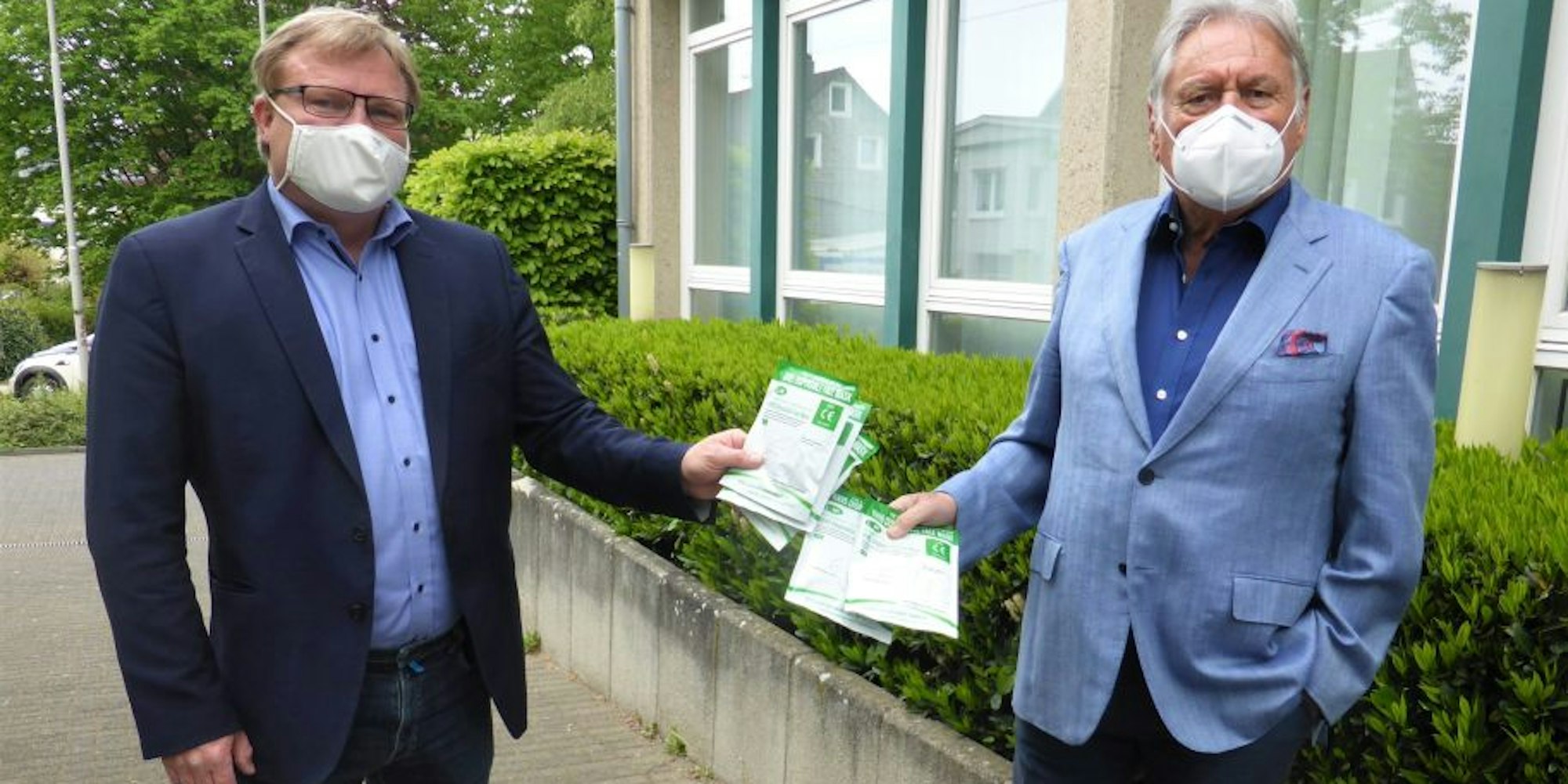 Bürgermeister Stefan Caplan (l.) erhielt von Kurt Lammert die Schutzmasken.