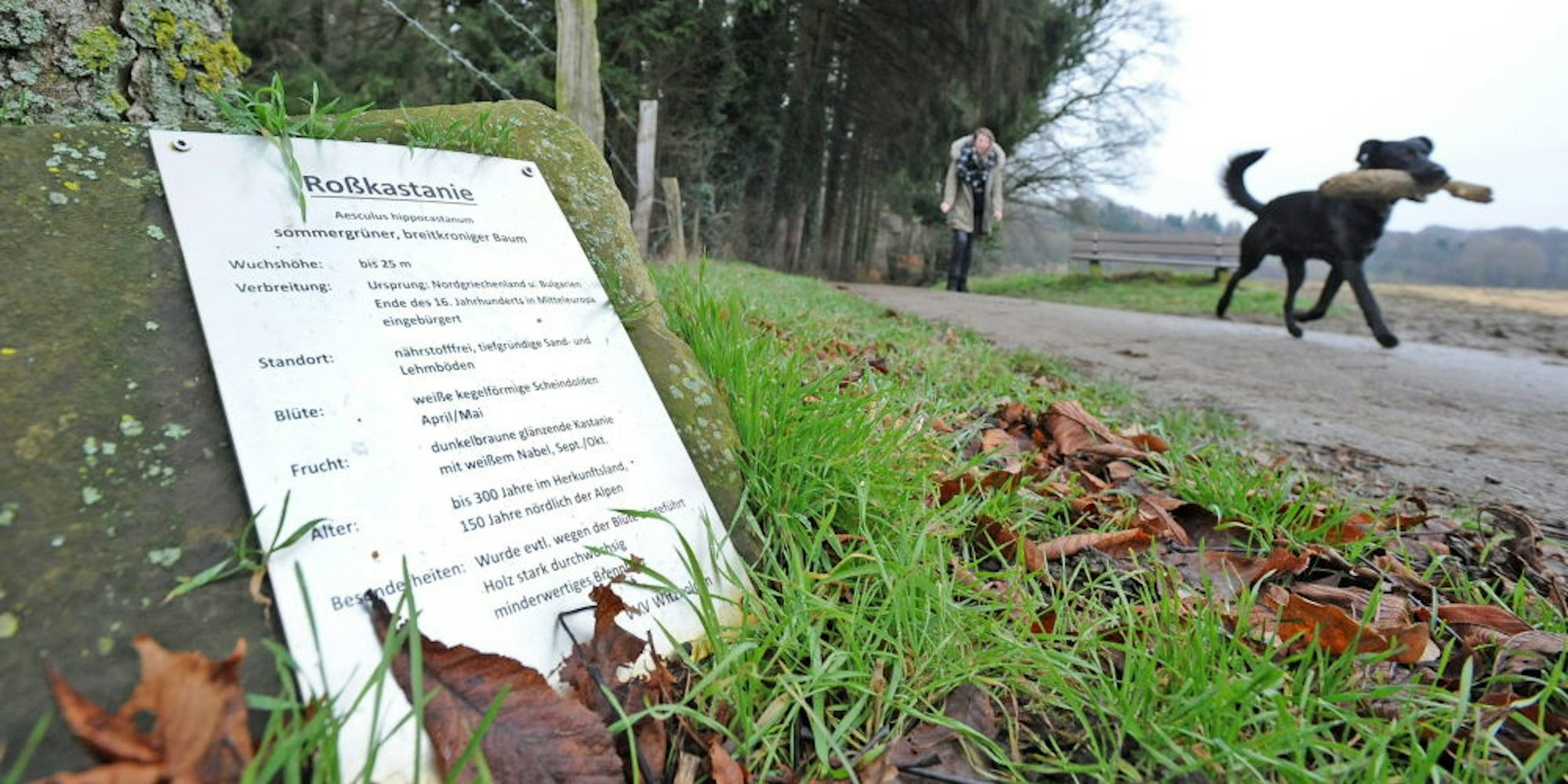 Erläuterungen zur Roßkastanie an einem Findling des Witzheldener Waldlehrpfades.