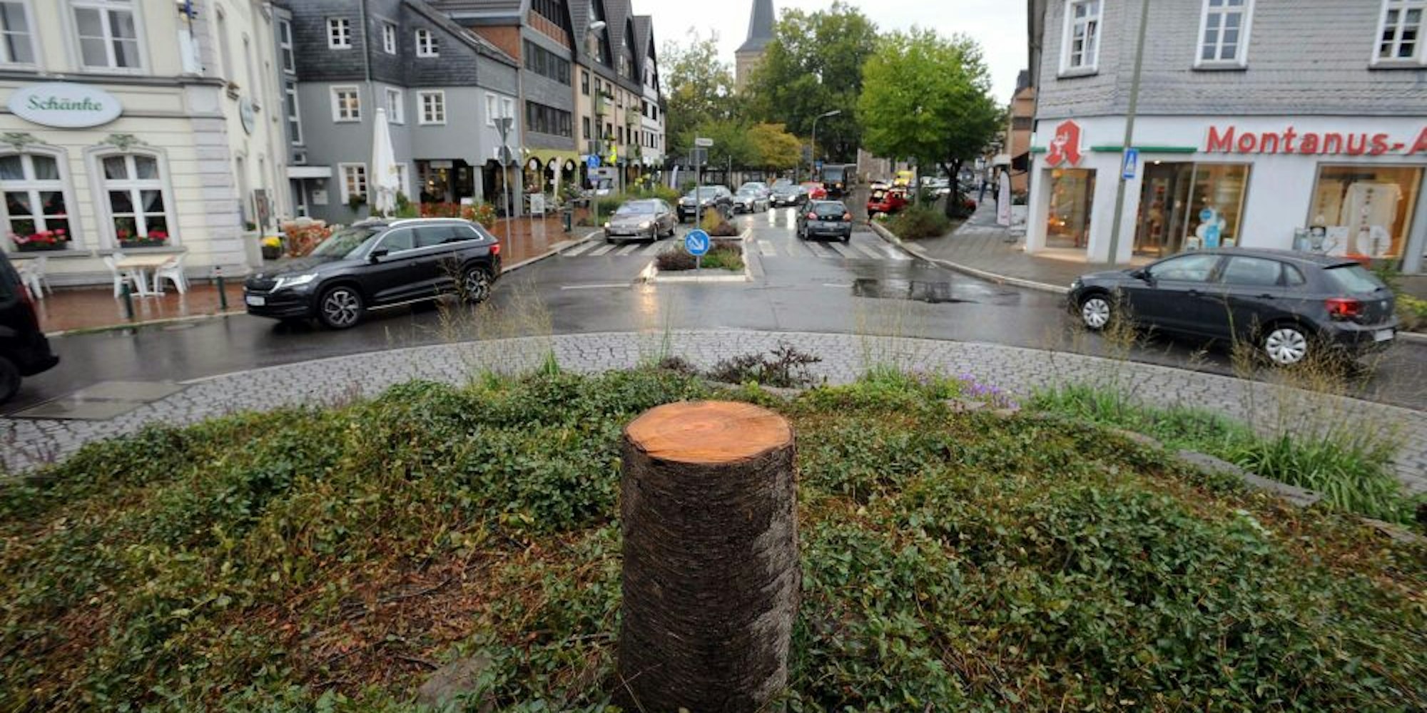 Leichlingen – Im Kreisverkehr an der Kirchstraße wird es in diesem Jahr in der Adventszeit keinen weihnachtlichen Lichterbaum mit beleuchteten Geschenkpaketen des Wirtschaftsförderungsvereins geben. Und im Frühling keine weißen Blüten. Denn der Baum ist weg. Nur ein Stumpf ist von der einstigen Kirsche in der Mitte der Verkehrsinsel übrig geblieben. Ein traurriger Anblick.