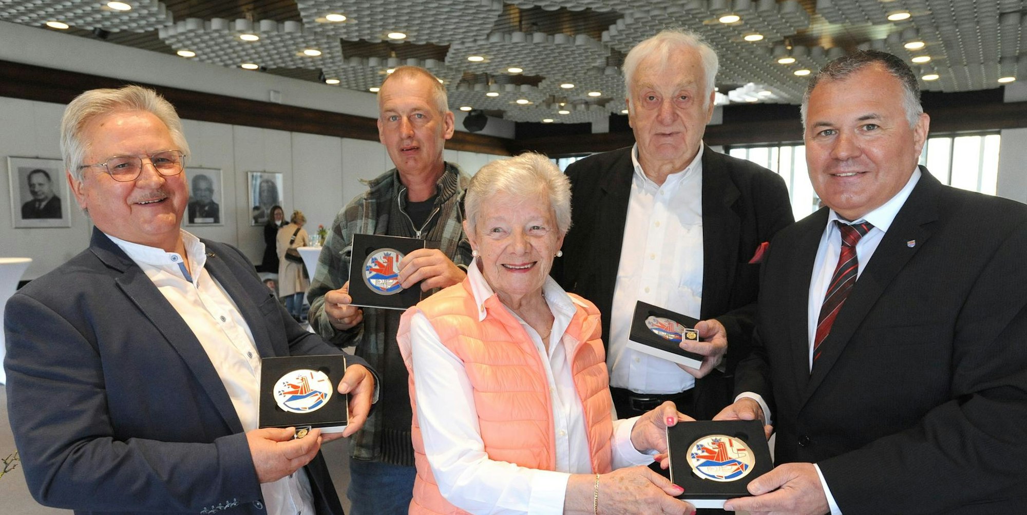 Die Ehrenplaketten nahmen in Empfang (v.l): Rolf Schneider, Frank Schmitz (Sohn von Willi Schmitz), Hannelore Kretzer und Georg Klose – Frank Steffes (r) gratulierte.