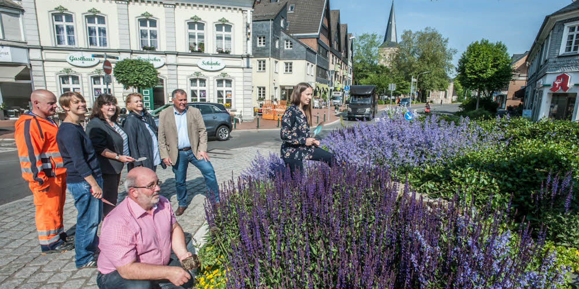 Der bunte Kreisverkehr an der Kirchstraße ist schon ein Blickfang für die Blüten-Aktion: Bauhof-Leiter Andreas Pöppel (vorne) und seine Kollegen (v.r.) Larissa Justen, Frank Steffes, Andrea Murauer, Ute Gerhards, Rebecca Hermann und Oliver Heidelberg.