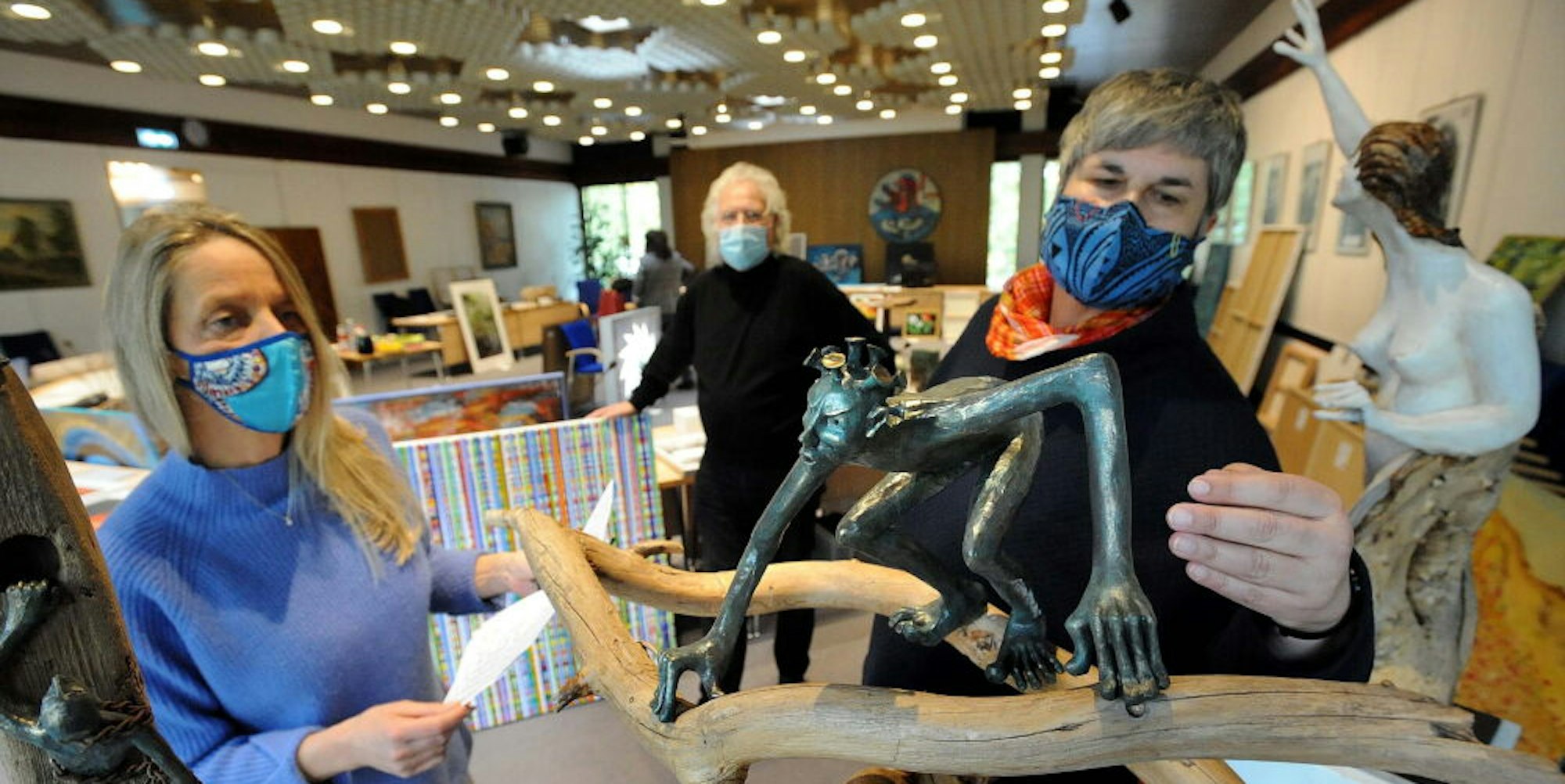 Die Jury – Annabelle Schleder, Manfred van Remmen und Annebarbe Kau – mit einer Corona-Skulptur von Irmgard Kaduk.