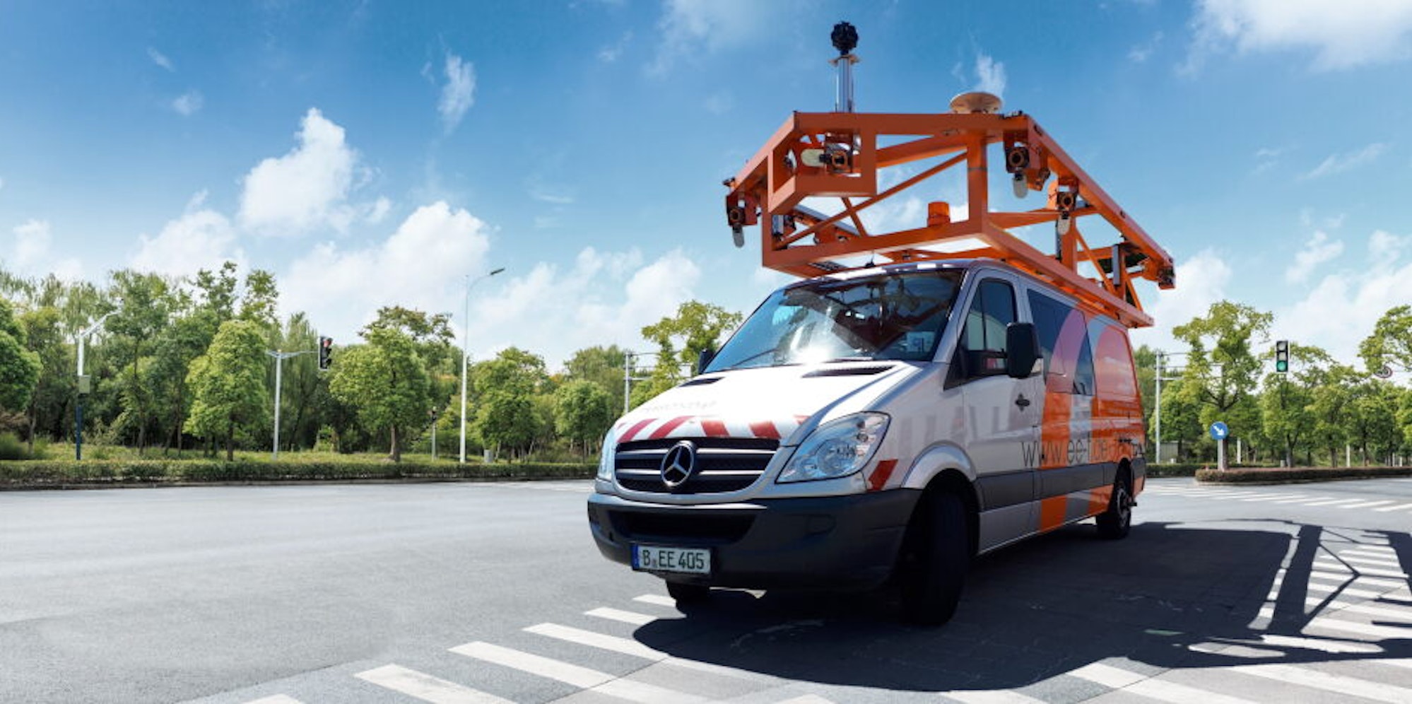 Der auffällige, orange-silbernfarbige Transporter ist auf dem Dachträger mit einer Vielzahl von Kameras bestückt, mit denen die Fahrbahnen abgetastet werden. Etwa 140 Kilometer Straßen und Wege werden bis Ende kommender Woche abgefahren.