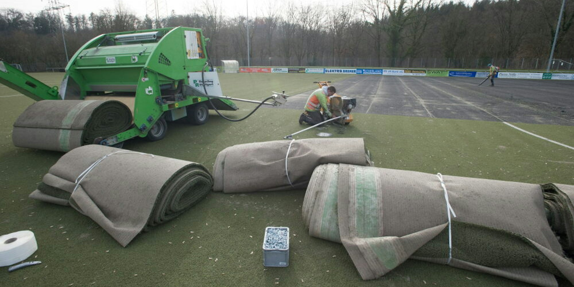 Kunstrasen, verschnürt und gerüttelt: Die Sanierung des Fußballplatzes in der Balker Aue ist angelaufen.